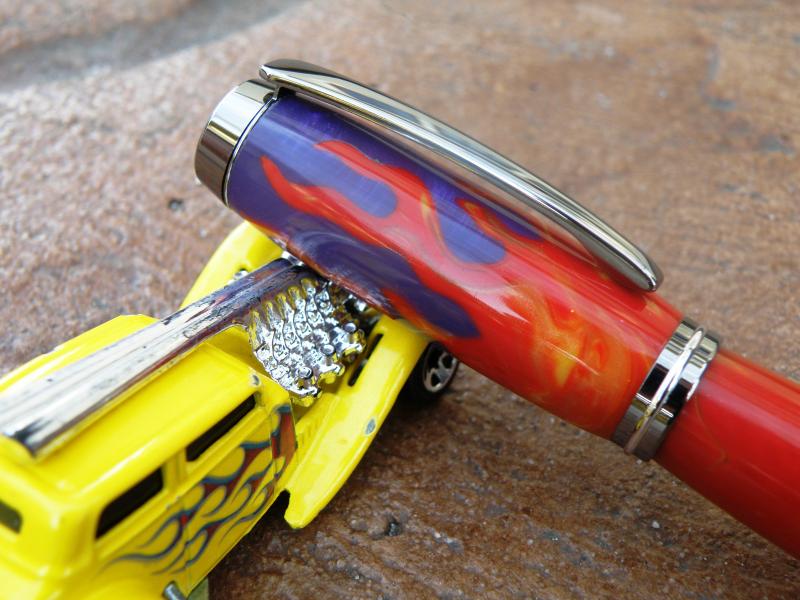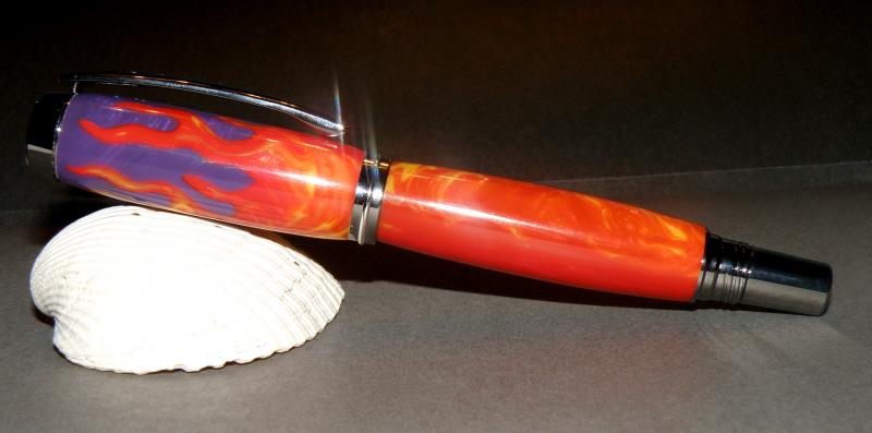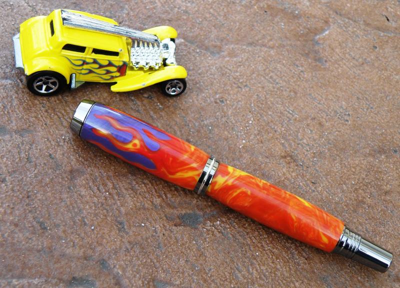 I had requested a fire blank from Jeff Powell. It is inspired by a friend's hot rod with a deep purple and orange/yellow flames.