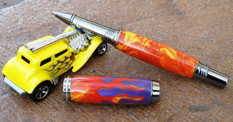 I got the privelege to watch this pen come to life from the scrollsaw cuts and Alumilite pour to turning it into this beauty.