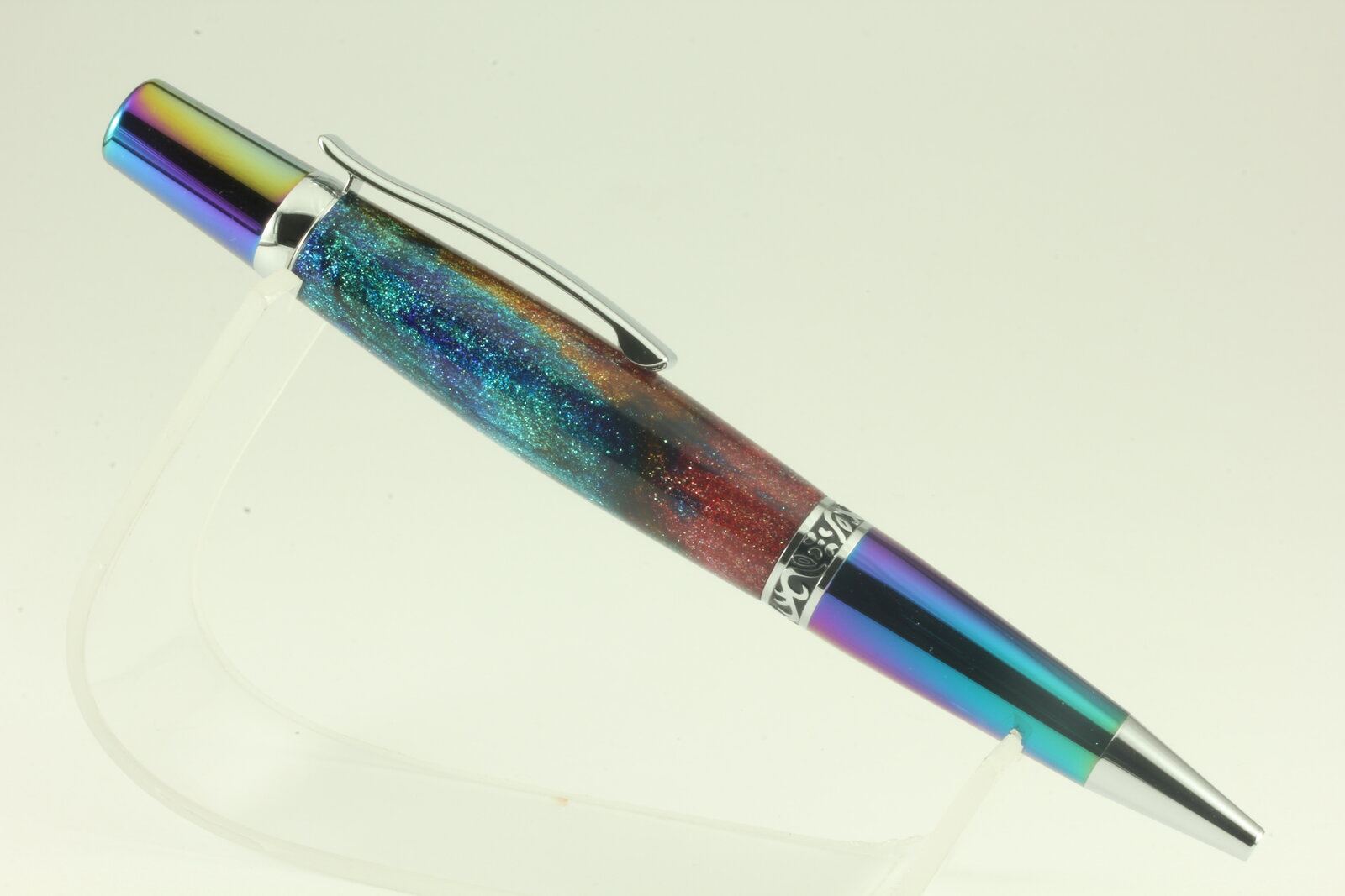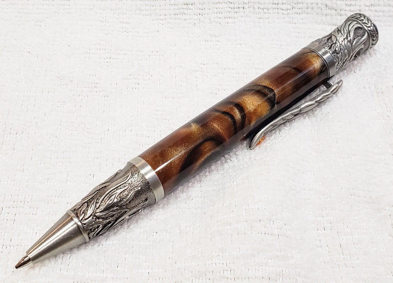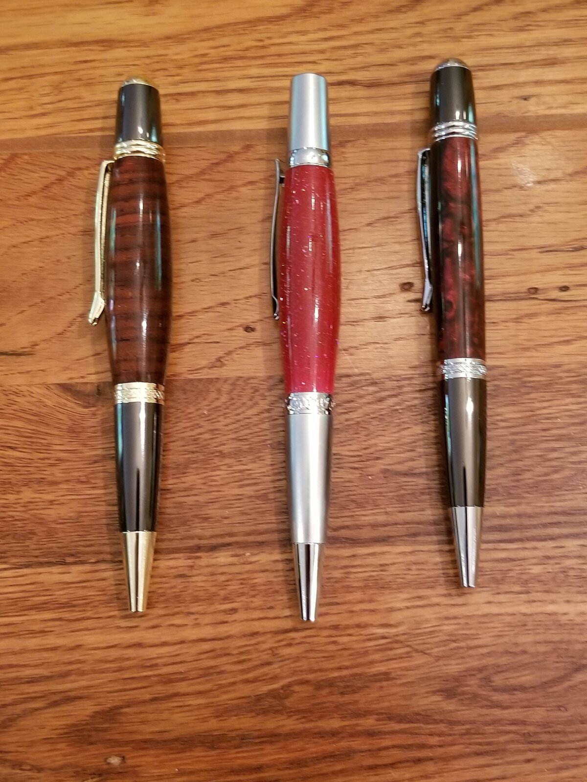 These are my first three kits of this type. The first was the crosscut cocobolo which is a stunning piece of timber. But she's a tad on the hefty side in my opinion. That sparkly girl was number two in a piece of Inlace Acrylester, still a little thick (By the way this one got a CA finish on top of the acrylic because those sparkles didn't look right without it.). The last one was a piece of Rhino blank that went on the meth diet because of some chipping. I got rid of all the chips but she's pretty skinny. I'd say almost dead straight.