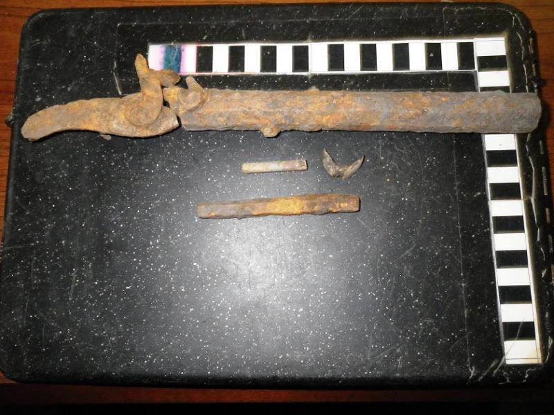 I do realize there's no stock on the remants of the gun in answer to the question above. And I do recognize this to be a cap fired gun rather than a flintlock. It's got the hammer and a place to put a cap for the hammer to hit. If it were a flintlock it'd have a mechanism for clamping the flint in the hammer and a striker plate in front for the flint to hit and create it's sparks.