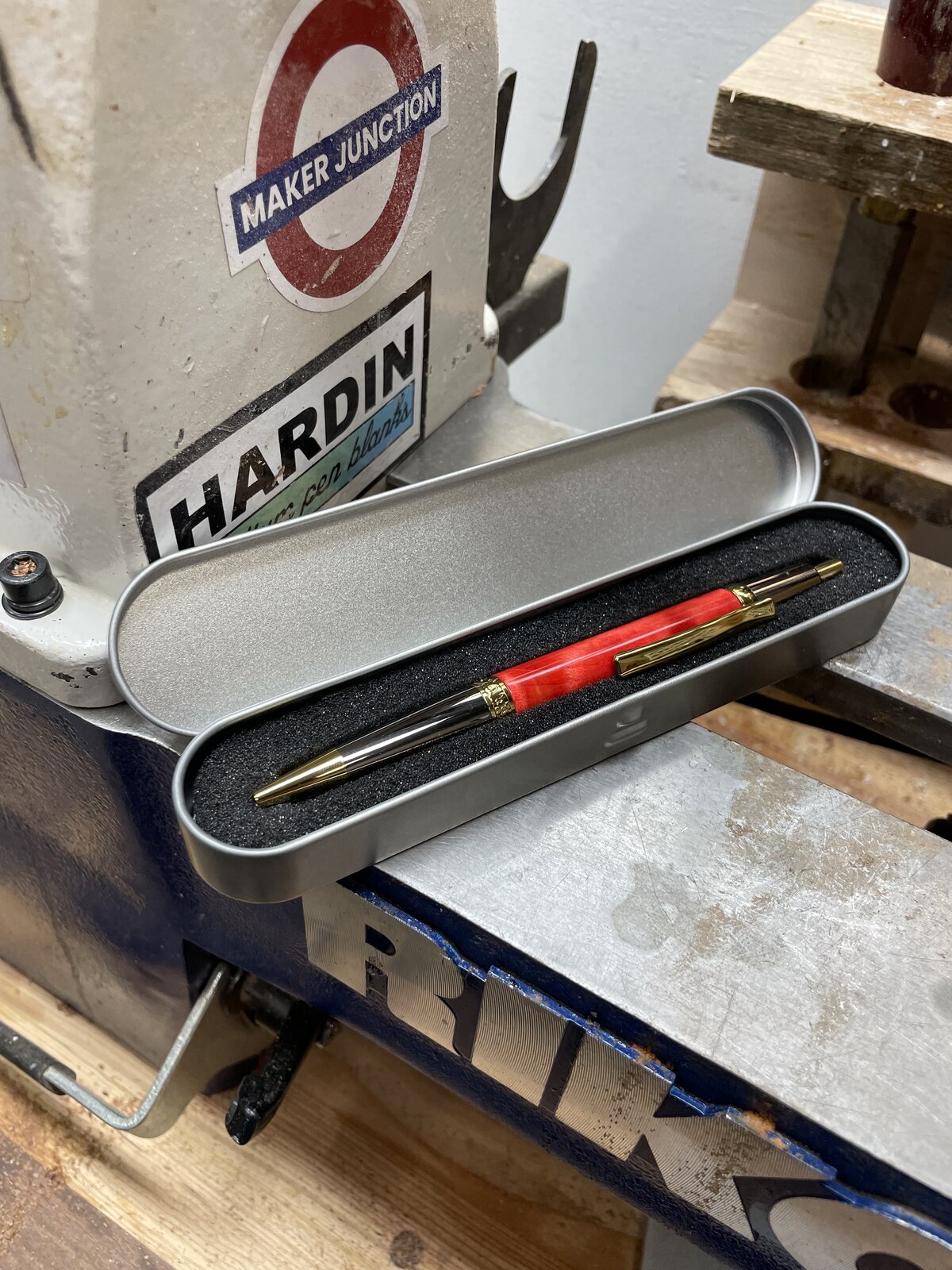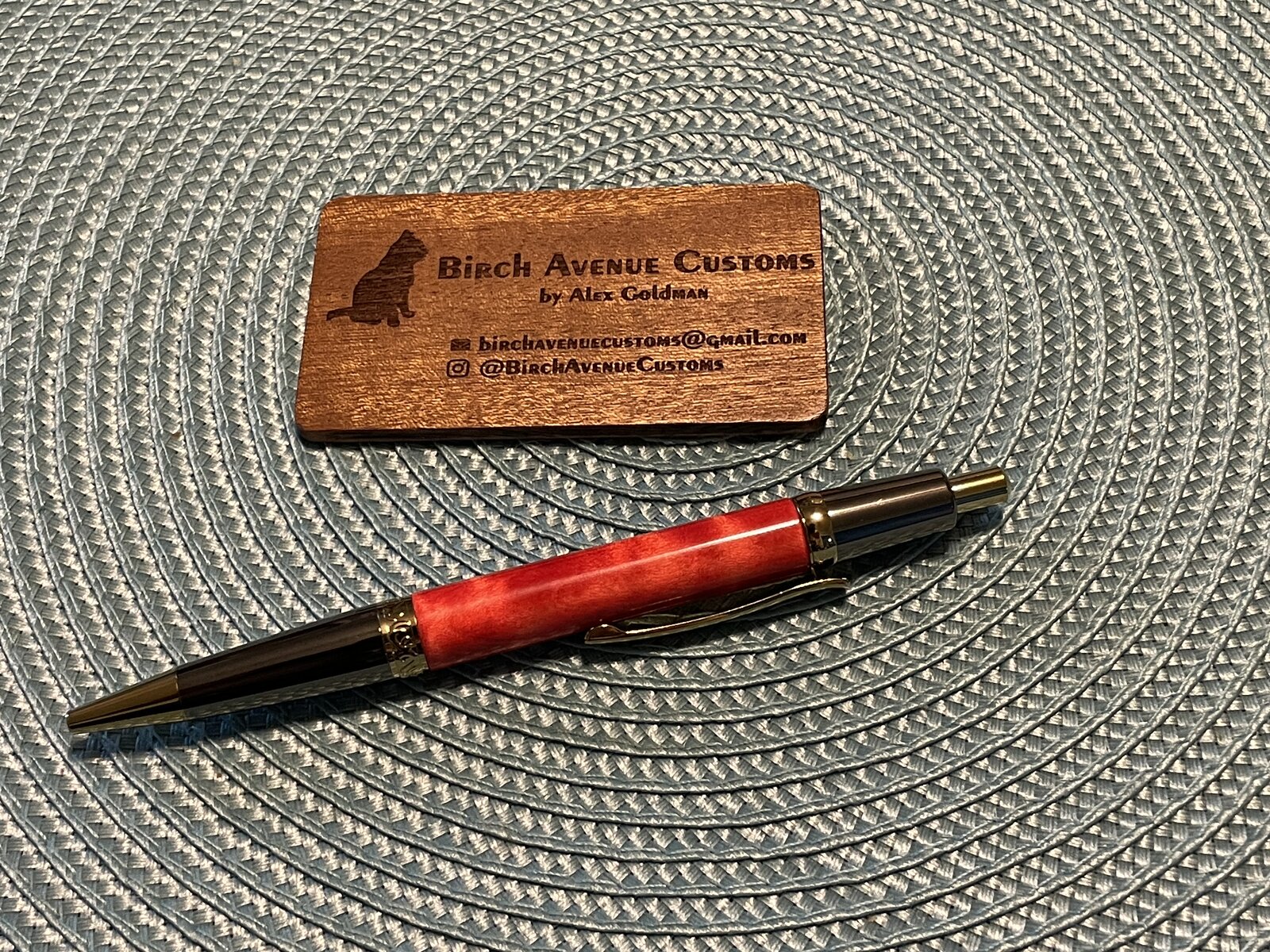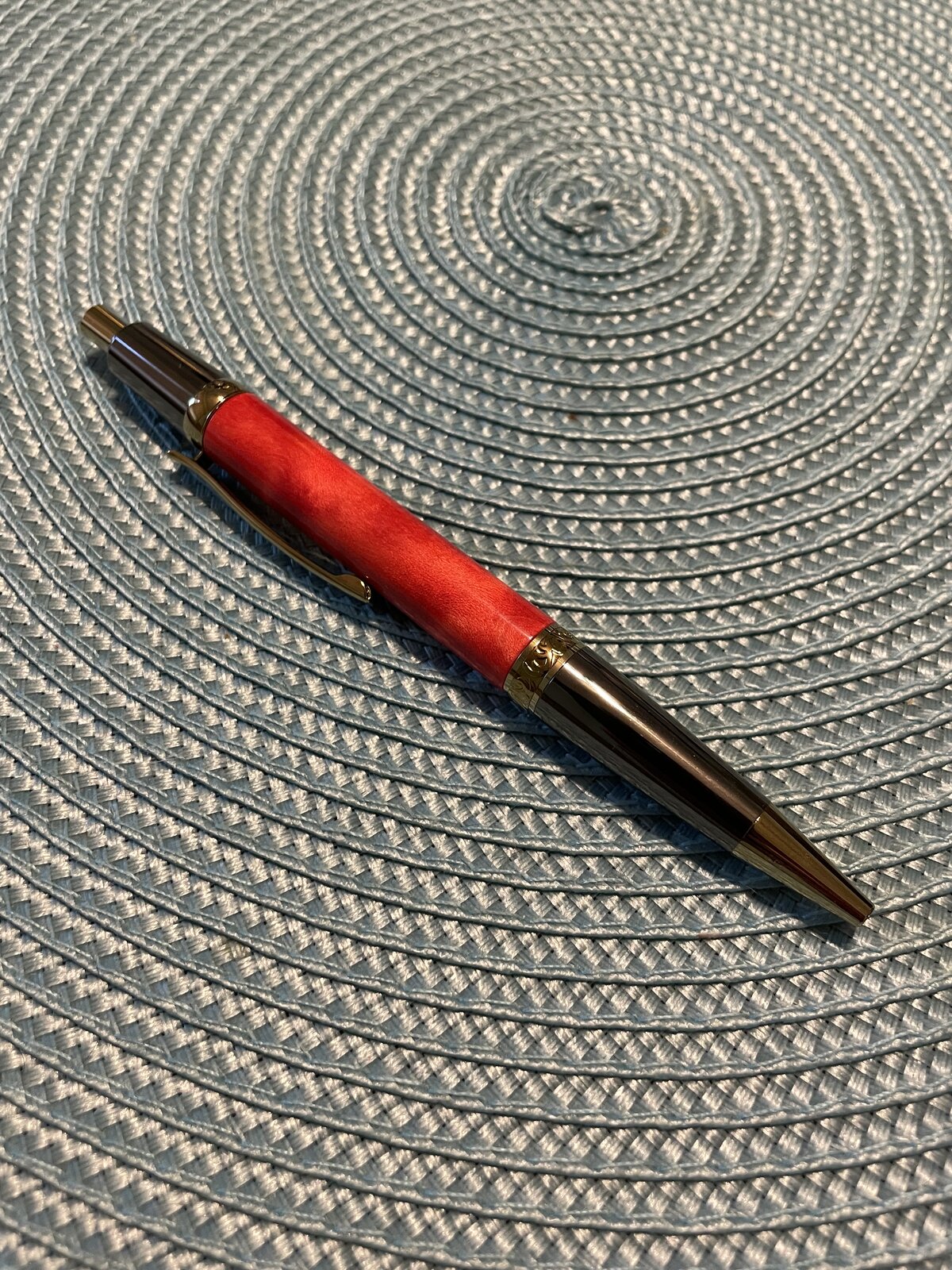 I had a higher up at work see the highly figured maple pens I was making and requested a red one. I was able to deliver a stunner of flamed maple stained red with a CA and polish finish with a classy Sierra silent click kit. It came out great.