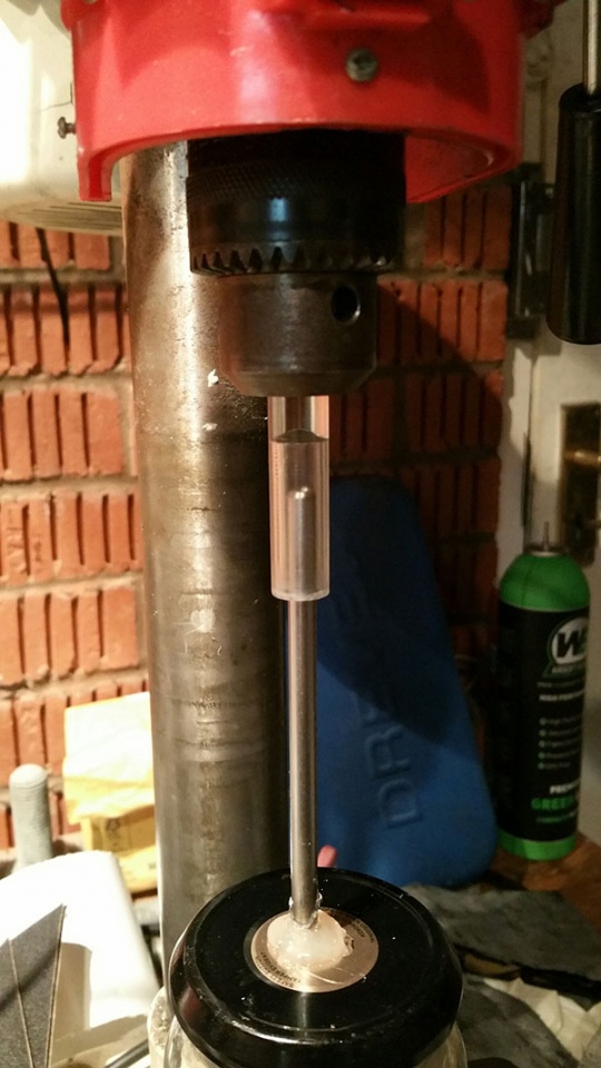 It's important that the stainless steel tube does not touch the walls of the inside of the pen piece, otherwise it will smudge. To ensure this, I mounted the piece of acrylic into the chuck of my drill press, and placed the jar on the bed. I will mention that at no point is the drill press turned on.. we're purely using it's quill action only.