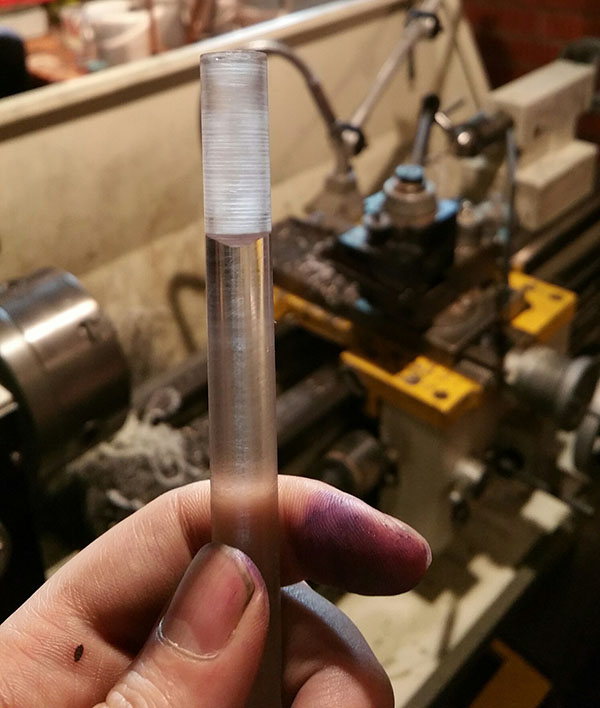 I wanted this to be as rough as poossible to test just how effective this method would be. so, I used a blunt 9mm drillbit and forcefully bored it through a piece of acrylic rod, which has left lots of tooling marks within as you can see.