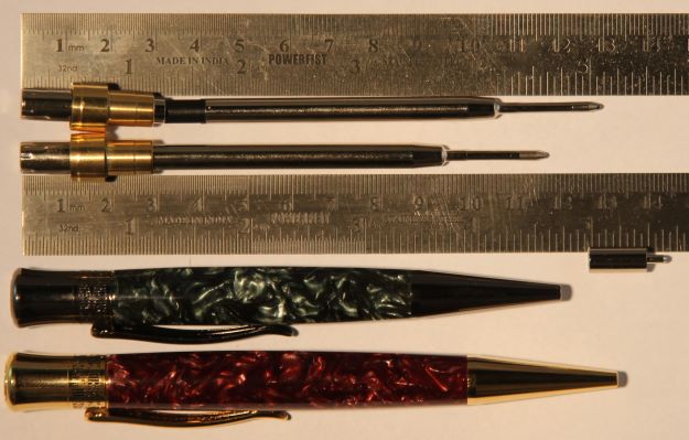 So in the picture, you will see the two completed Glacia pens along with a ruler to show their lengths. . Both pens have their refills fully retracted.