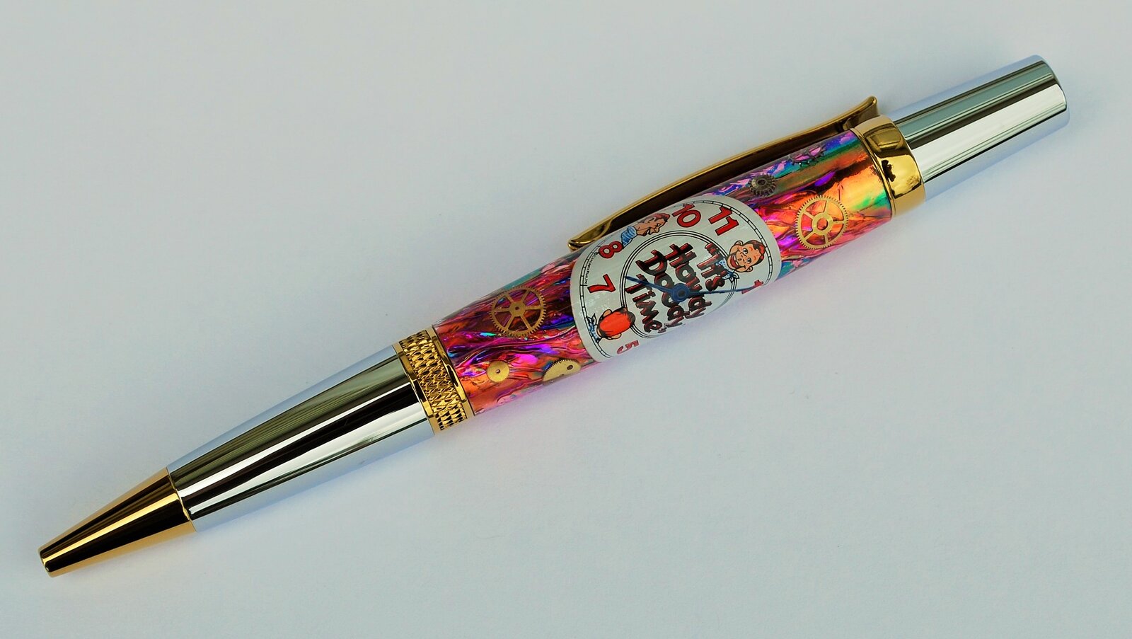 The first is a watch part pen I finished for my mom on Mother's Day, over a "Precious" Opal blank, on a Diamond Knurl ballpoint. I was trying to match the opal blank background to highlight the colors in the watch face.