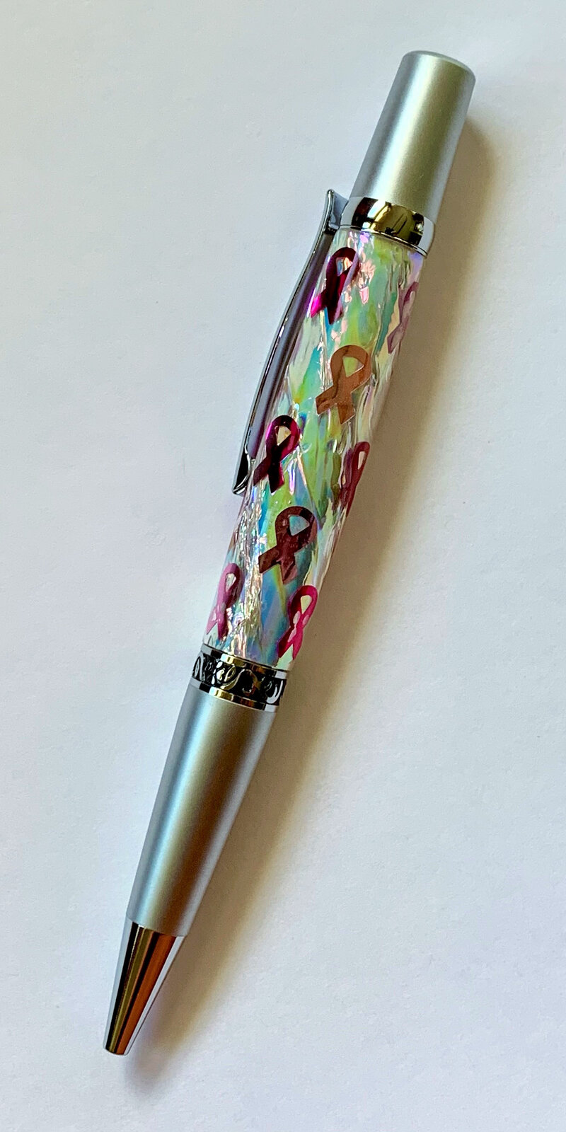The second is a pen and blank I made for a family friend who is a survivor and heads up fundraisers for others in need. It's a cancer ribbon blank made over a "Moon glow" opal background on a two tone chrome sierra.