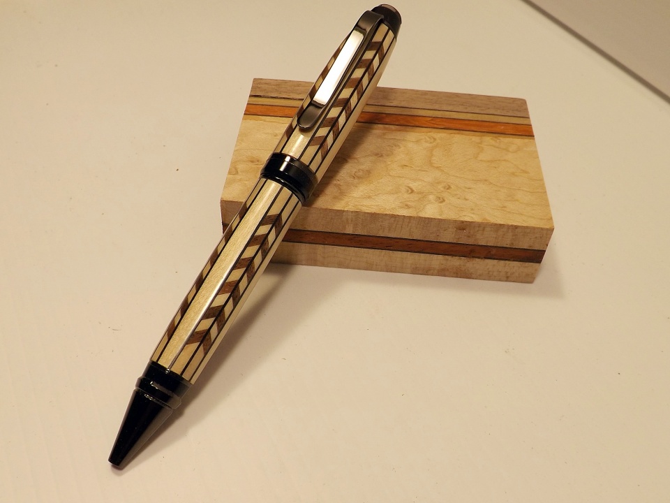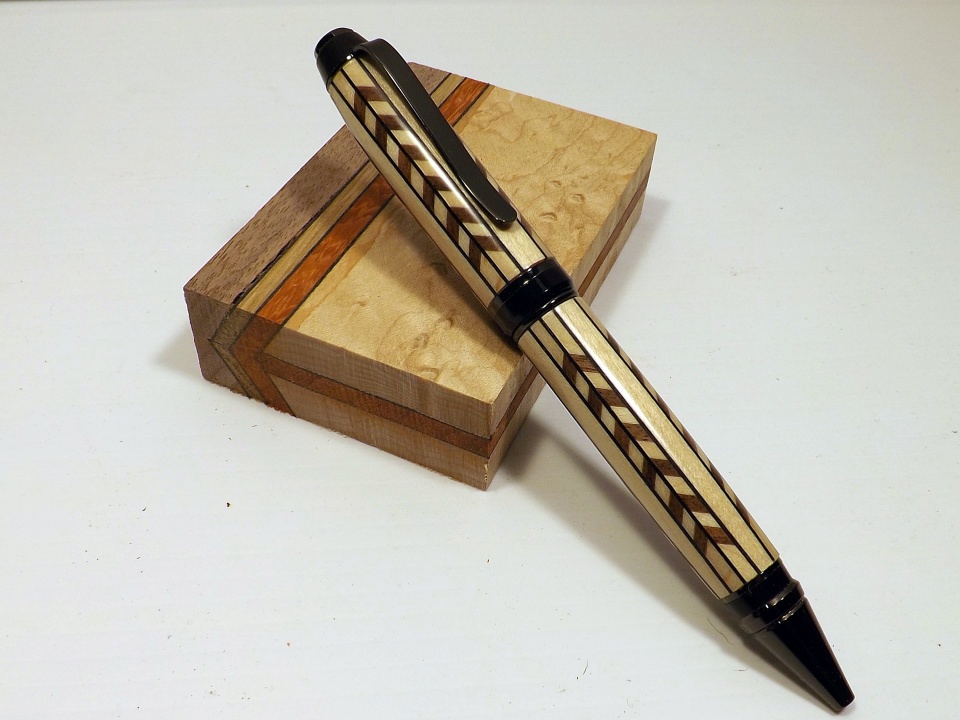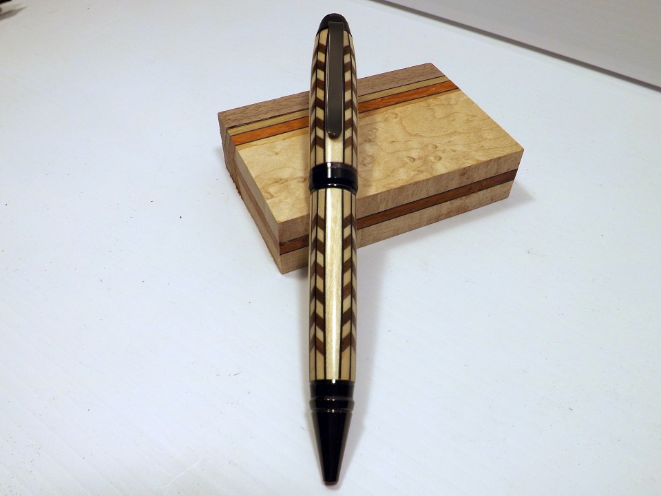 This was my first attempt at an chevron like the ones that Mark James has posted here, turned out well. There's a little bit of a learning curve and some things I would do differently on the next one, but all in all turned out well. Mounted on a Cigar Pen Kit in black chrome, with maple, dyed black veneer and a little walnut.