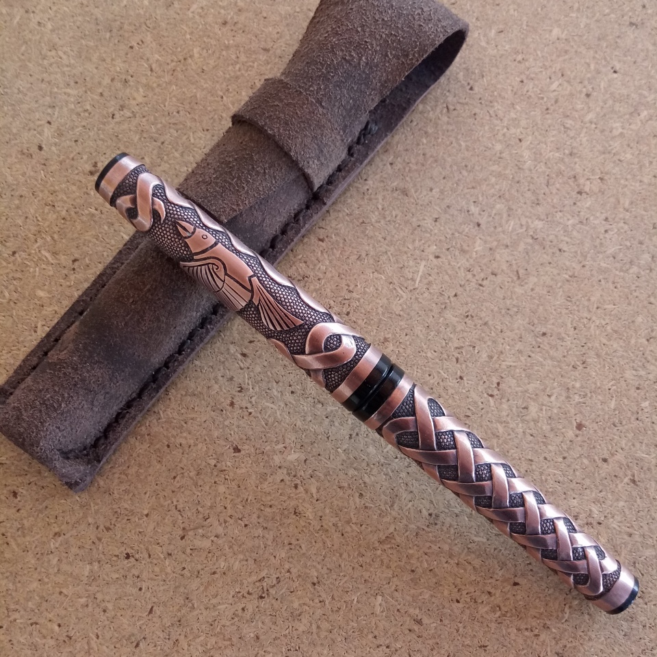 Huginn and Muninn (Memory and thought) were Odin's ravens which he send out to gather information. As a pen is used to capture thoughts and memories I thought it a suitable theme for a carved pen.