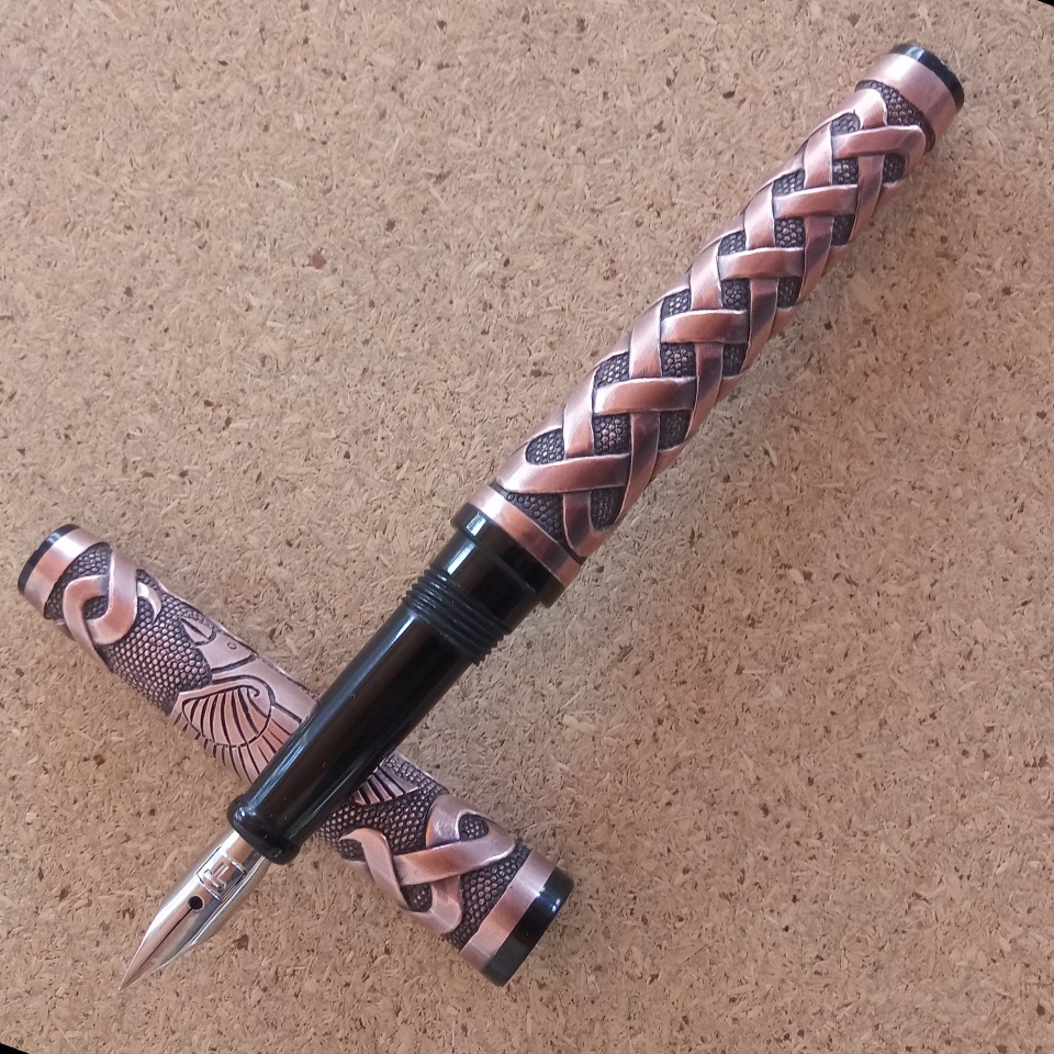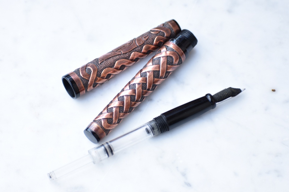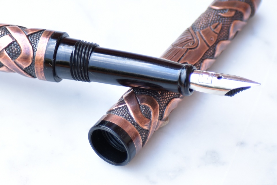 Copper and ebonite, plexiglass piston filler, ebonite feed, steel nib.