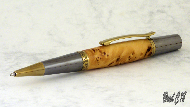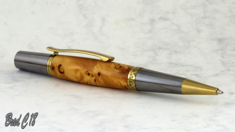 Another piece of Huon Pine from Greorge. This is the off cut from the blank I used on the Professor pen. Gold Titanium with a CA finish.