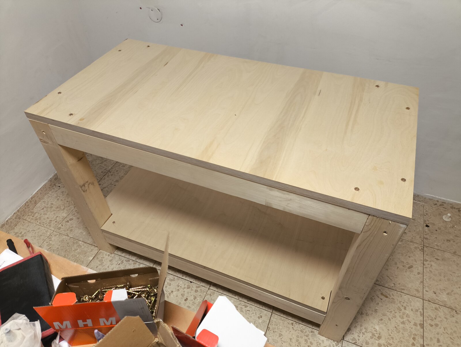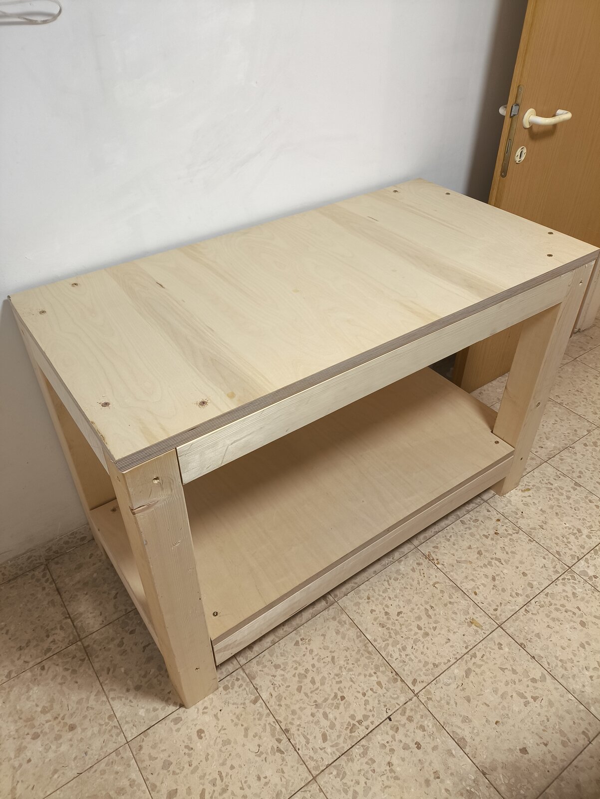 The wood is 3.5×3.5 inch pine. The upper and lower surfaces are 1 inch thick birch plywood. The wood was supplied to me already cut to size from the mill, I assembled it using only screws.