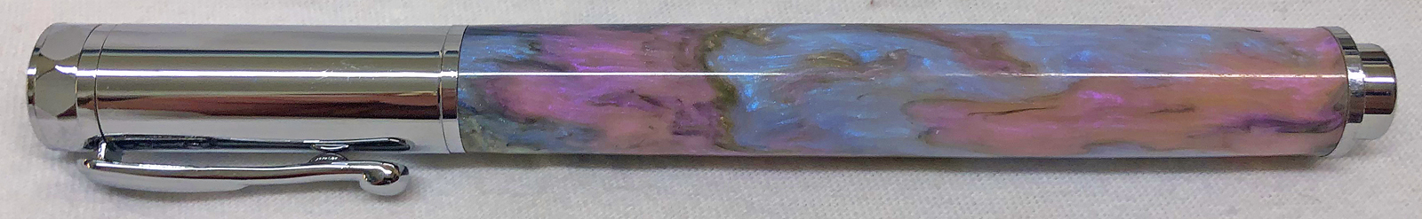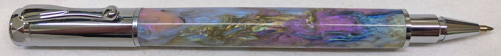 The kit is a Chrome Magnetic Rollerball with a straight clip from Crooked Mill Woodworking. I cut a small piece of plastic from the cap that came on the rollerball ink refill and installed it over the end of the refill to keep it from protruding quite as far. The difference can be seen between the refill extension on the "glamor" photo vs the extension in the straight "documentation" photos. The long extension seems to be indicative of this pen design. I have found though that Pilot G2 refills do not extend quite as far as the standard rollerball refills do.