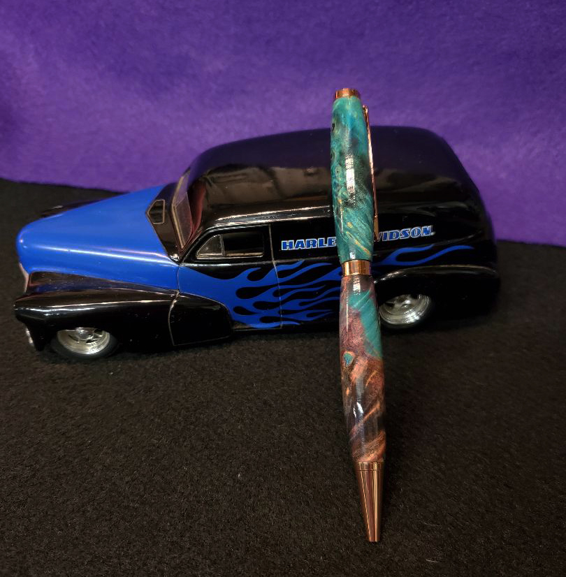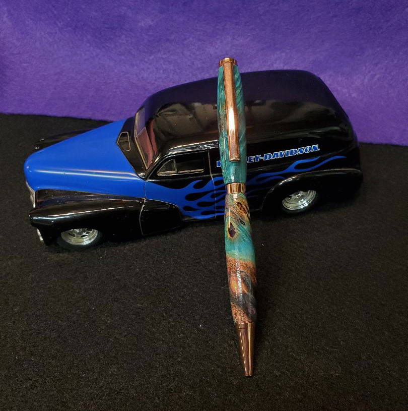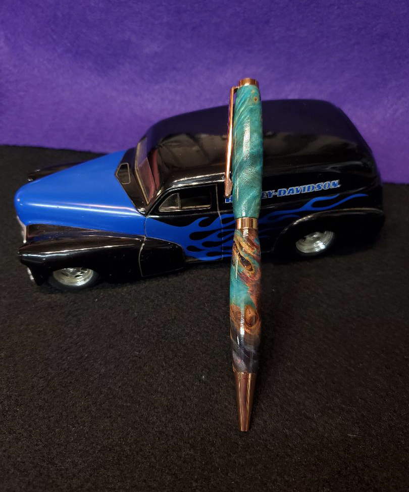 I bought a couple Double Burl blanks from BenPen. They looked good square so I knew they would look better round. Here's my latest slimline sitting on one of my Harley cars.