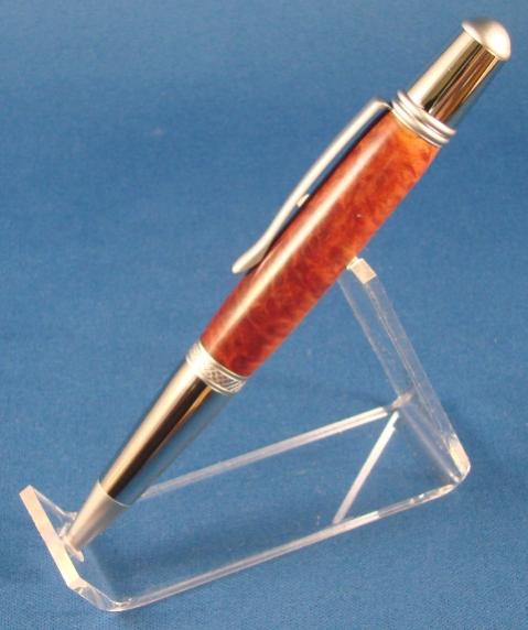 I have always liked the way an amboyna burl wood looks on a pen. It brings out the best in any plating you use. Two toned chrome sierra from ernie at BTW, ca/blo finnish on the narra. All comments and critiques on pen and pic are welcome. Thanks for looking.