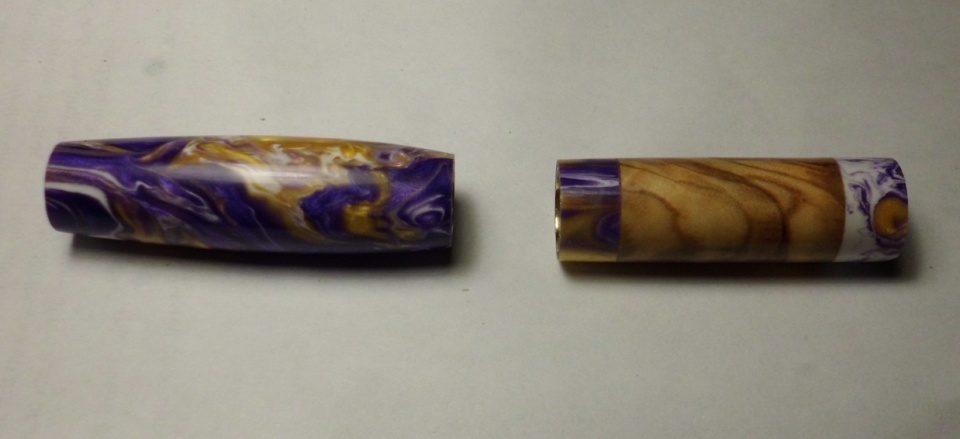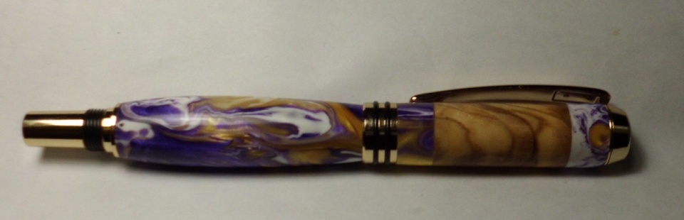 My sister ordered a pen from me as a gift to her friend ... the friend favored purple and white and gold colors, and also liked things of religious symbology. Body of pen was purple/white/gold acrylic, had a blow-out on the cap and lost half the material (possibly had a bubble or two in the mix or a poor glue-up). Spoke with my sister about what to do, didn't have another acrylic blank ... found out about the religious angle and asked if she would like some Bethlehem Olivewood in there ... and the answer was yes. The cap ended up being acrylic on both ends, with Bethlehem Olivewood in the center.