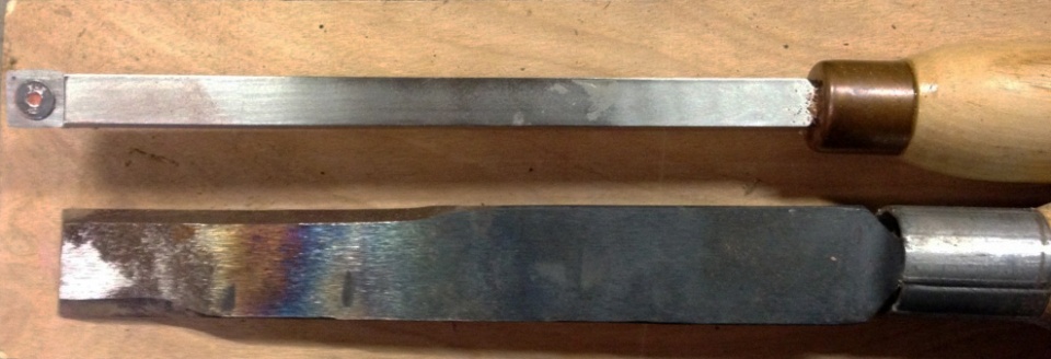 William Weathersbee is a blacksmith as well as a turner and makes lots of his own tools. He designed the one shown in this photo especially for making lidded boxes. It's made from an old car spring and has about a 1" cutting edge on the front & one side and about a 2.5" cutting edge on the opposite side. It really helps with squaring up the mating surfaces on the lid & body of the little boxes.