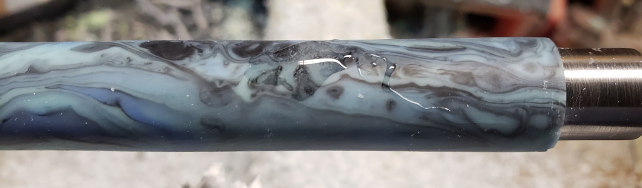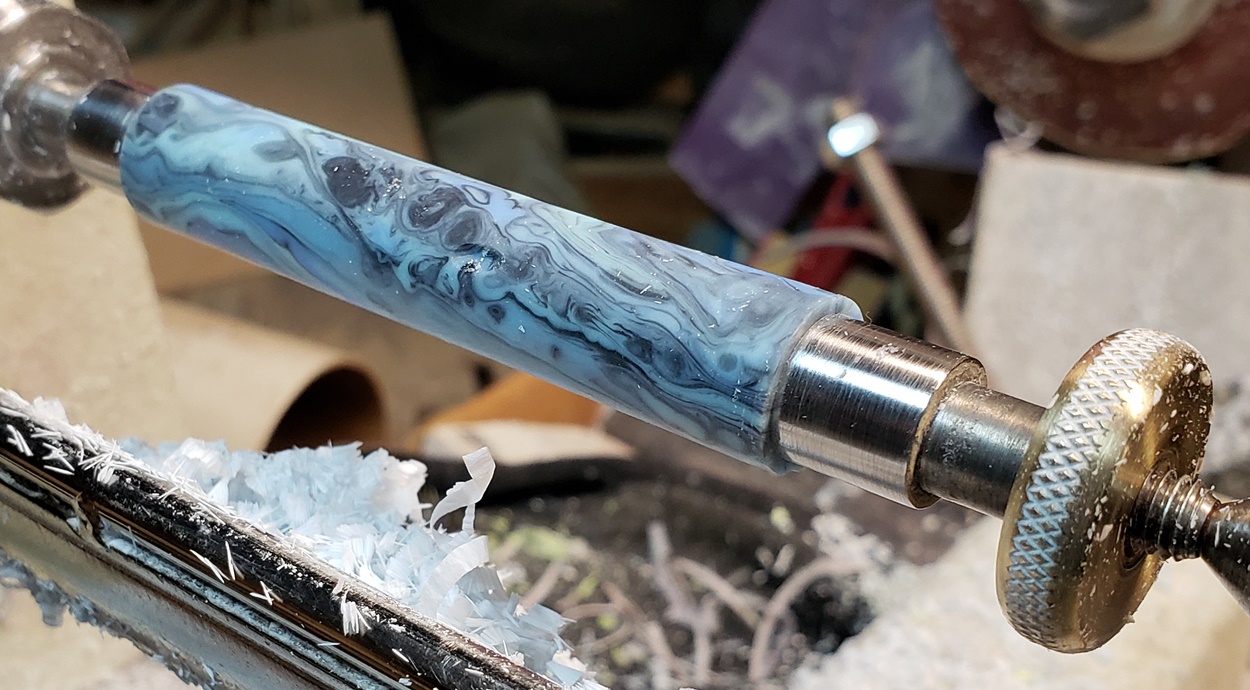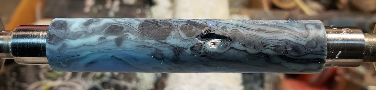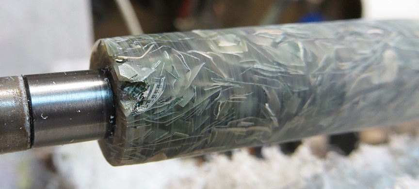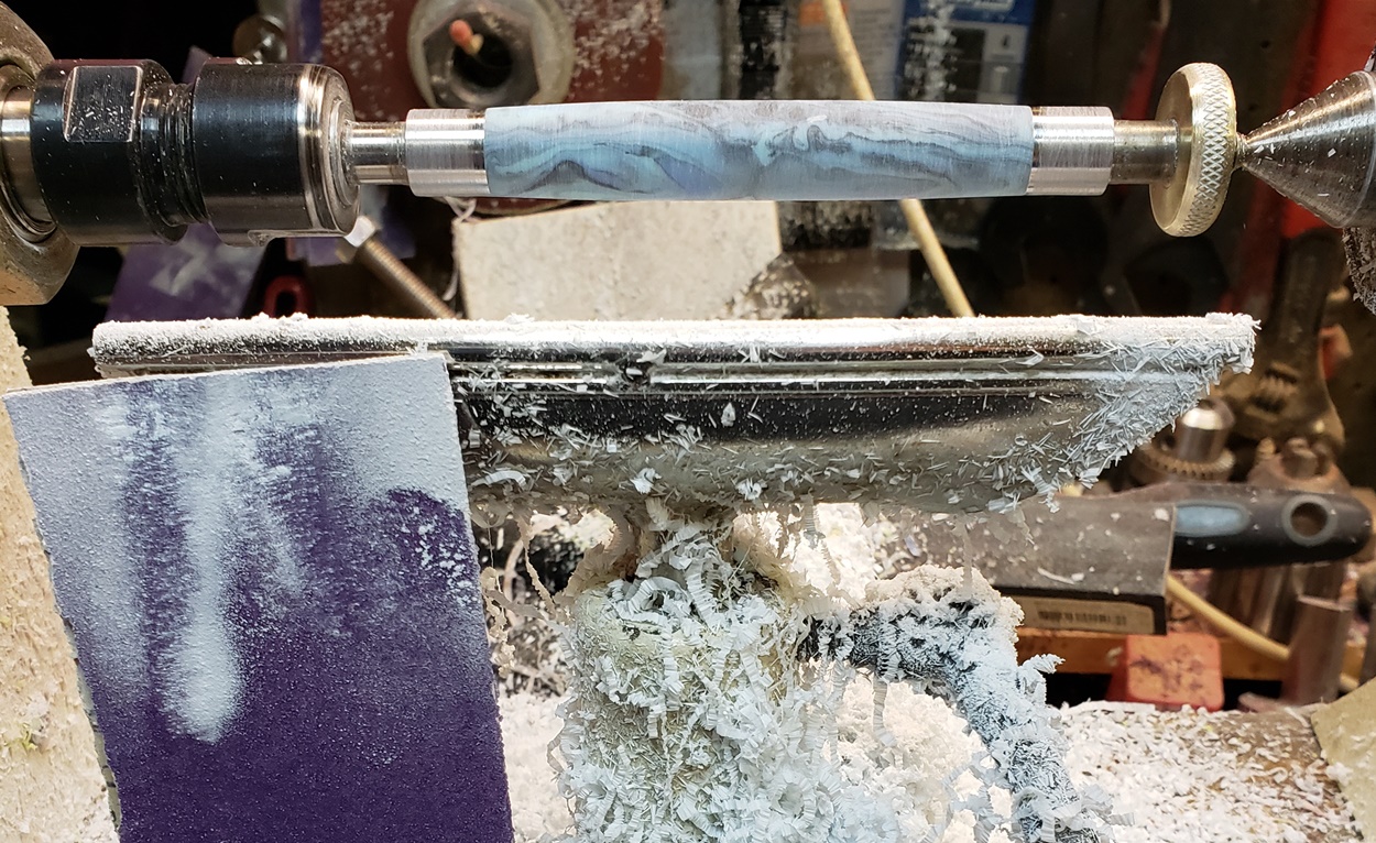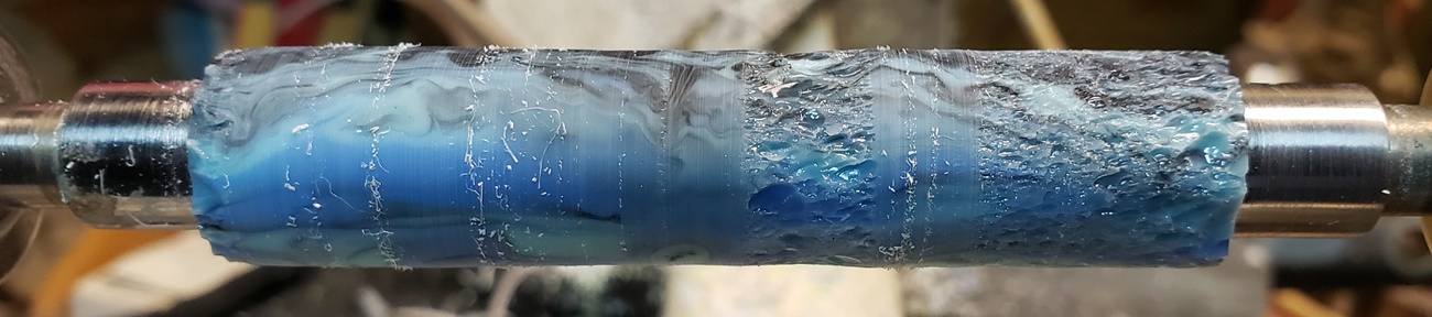 I hate hate HATE turning polyester resin, inlace acrylester, etc. blanks. But every once in a while, I feel the overwhelming urge to punish myself. And I'll admit, this is better than smacking myself in the face with a saucepan. But only just. I tried several different gouges, and three different carbide cutters, including a negative rake. I ended up getting the best results with the flat R2. I've tried the negative rake cutter several times, and it just doesn't blow my skirt up. I don't see what all the hoopla is about.