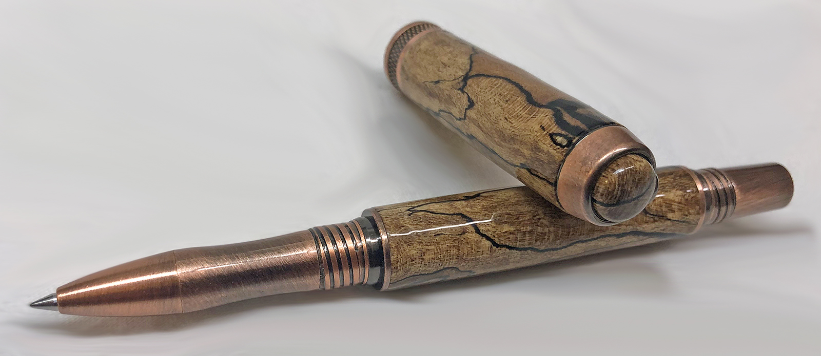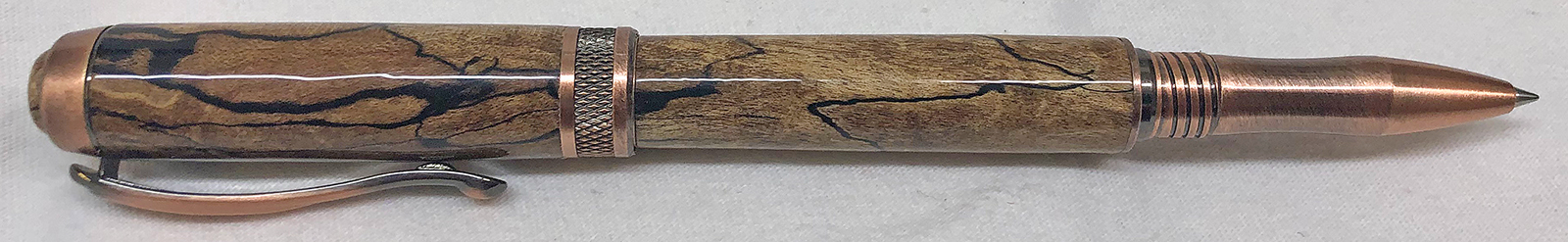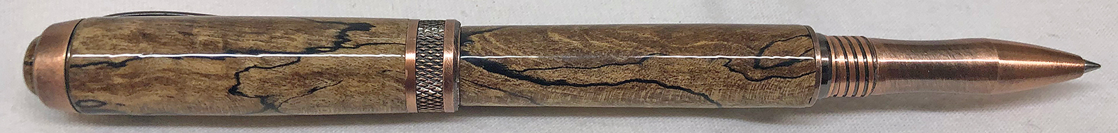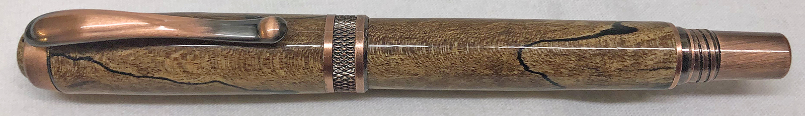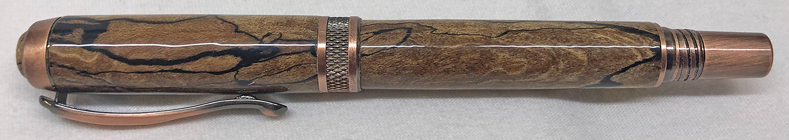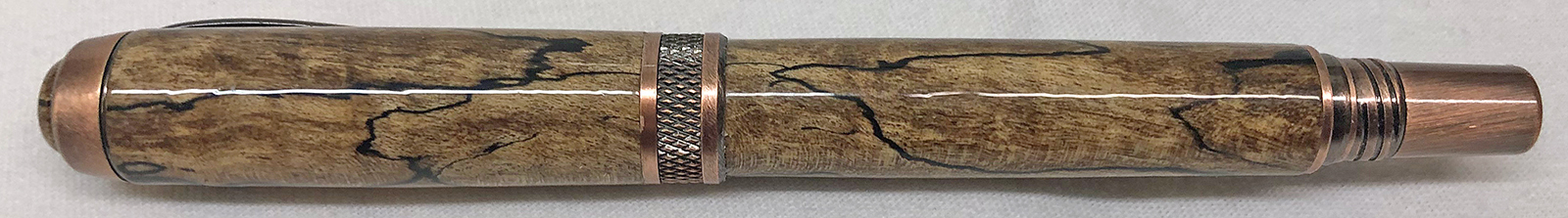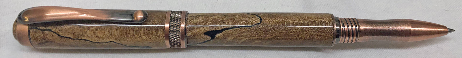 This is an Antique Copper Diamond Knurl Rollerball from Exotic Blanks. I figured it was about time that I slow down on Alumilite pens for a while and make one with wood for a change. As the title says, I hope the person that gifted the blank to me remembers it. If it is you, please let me know if you remember what kind of wood it is. I'm pretty sure that someone gifted the blank to me as part of a PITH sometime in the past 6 or 7 years. I usually keep track of those kind of things, but for some reason this one escaped. It was a 3/4" x 5" blank of some kind of spalted wood. The blank had been stabilized. I think it made an amazing pen and I would certainly like to recognize and thank the person that sent it to me. Even the custom turned cabochon turned out really great! I used GluBoost and a coat of Renaissance Wax for the finish.