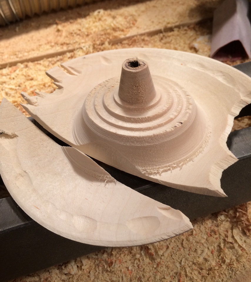 You know that when turning green wood...and thin that you start cutting at the rim and work your way in....leaving the bulk of the center mass still intact and you NEVER EVER go back out to the edge?...Well, I was working on this thin green maple platter and I had that momentary lapse of judgement and came back out towards the rim with a pull cut....just shaving the surface...smoothing the previous cut. That is when it happened. In a true fraction of a second, things went bad...my gouge chattered and a piece of the rim went flying past my head!