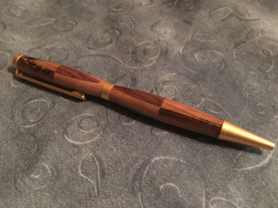 I used white oak, walnut and wenge to make the blank and used a satin gold slimline kit. I think it turned out pretty nice for still being new at pen turning. It's my best finish with CA so far. I still need a little more practice with getting the ends to match up perfectly with the hardware, I can still feel a slight edge, maybe 1/64" or less but I am seeing progress.