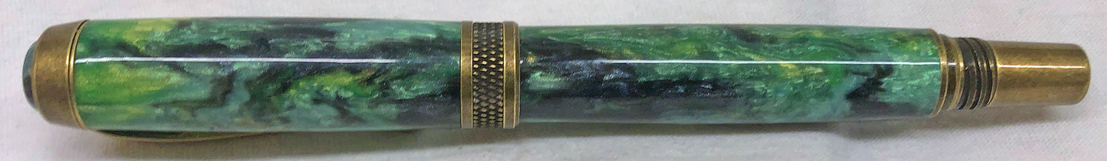 I called the blanks Golgari which is the name of a guild in the Magic The Gathering game. It is represented by a combination of the colors black and green to represent a blend of undead and natural creatures - a balance between life and death, decay, and re-growth. For the pour I used Alumilite Clear Slow with Eye Candy pigments, 50% Ronin Black, 20% Gage Green, 15% Nori Green, and 15% Jade Green. I was a little worried since the resin was getting pretty thick before I got it all poured and into the pressure pot. There was one small void (bubble) in the blank that I turned, but it disappeared with just a single coat of GluBoost. I usually don't overload the resin with pigments as I like areas that still have some degree of translucency, so I painted the inside of the blank with green acrylic paint and also added a drop of it to the epoxy I used to glue the tubes in. I also removed the factory cabochon and replaced it with one made from a piece of the blank.