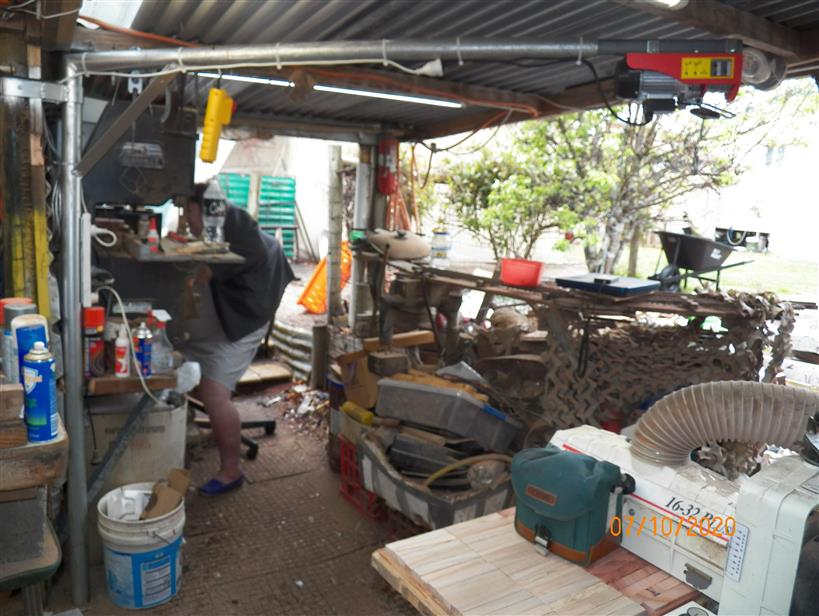 Lifting large/heavy pieces by myself into my bandsaw table that was raised about 1' from the very beginning so that It would have a better working height has been proven the become a problem more and more as I age and strength is lacking so, I have lost many days of work from hurting my back lifting those heavy chunks of wood to be worked on the bandsaw so, a few weeks ago I decided to order a hoist winch of 125kg single line pull capacity and started to draw out a "L" shape metal frame made of galvanised 50mm heavy duty wall thickness, some cement for the bottom hinge footing and some sort of a top hinge to be attached to a wood post next to where is swing arm/frame will be installed.