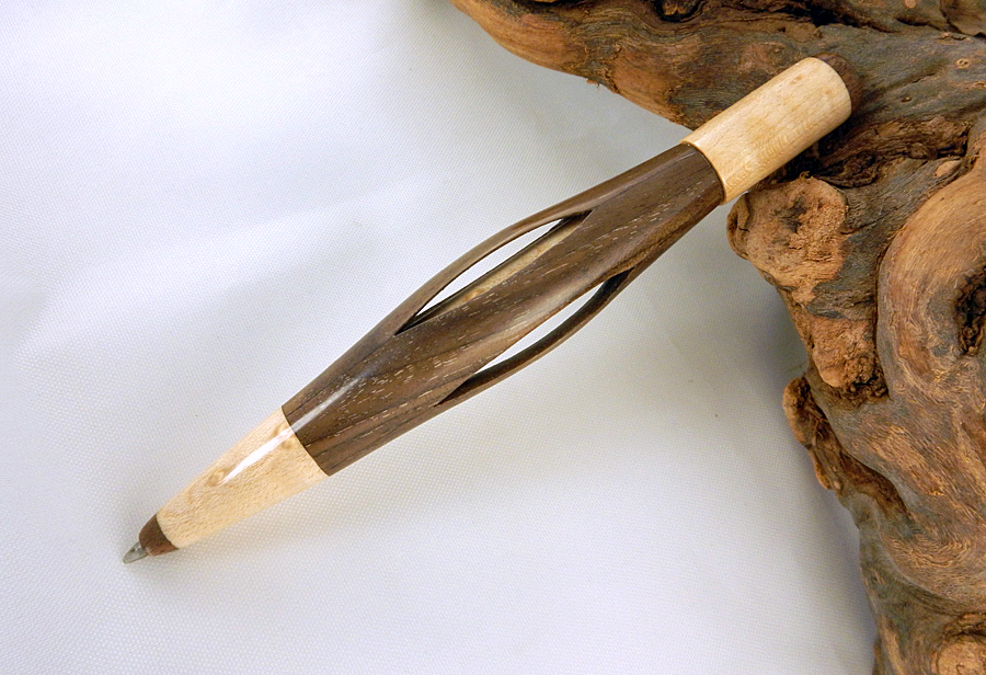 This pen body was made using black walnut and the inside out turning method. The center tube is brass with Birdseye maple turned down to 15/32"s around it. The cap and the nib both are made using Birdseye maple with black walnut accents. A transmission from the Nevus pen parts was used. The pen has a Parker type refill. This picture was taken by Patricia Lawson.