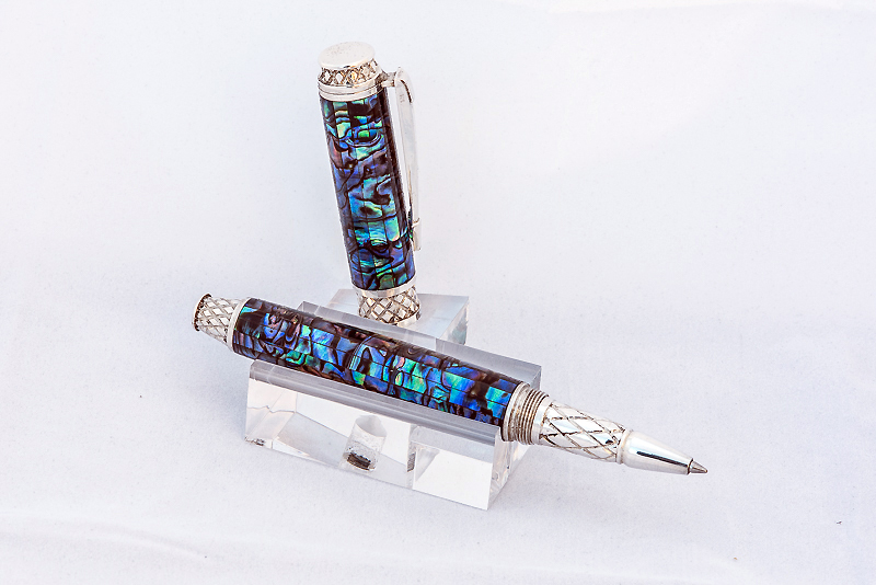 This sterling silver kit was won in the IAP 12th Anniversary donation drawing. It was graciously donated by Mike Redburn of Silver Pen Parts. The tubes were custom fit with abalone by Jim Pratt and the team at Signature Pen Supply. I added the ink cartridge as my part of the group effort.