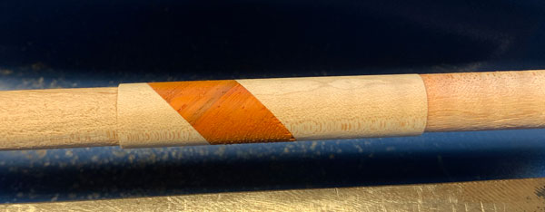 Using a compound miter saw I made a row of curly maple blanks with a 45-degree stripe of dark wood (padauk).