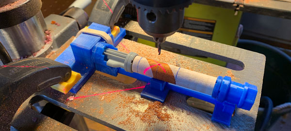 I've written a few posts on the evolution of this 3D printed jig that clamps to my drill press. In a nutshell a roughed blank is held in place and rotates at set angles with the help of a guide.