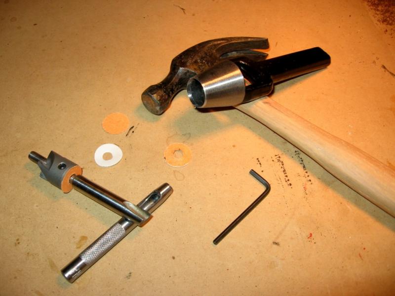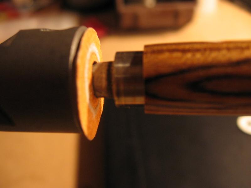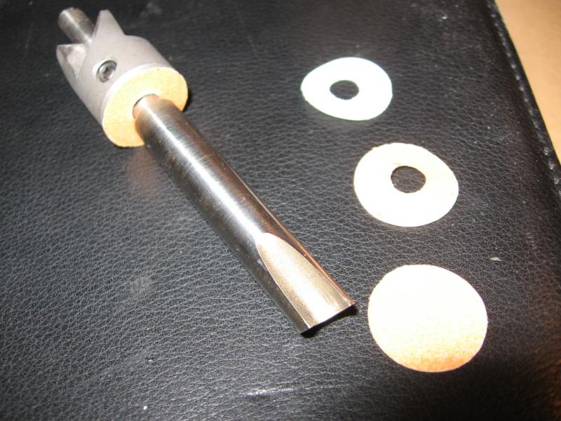 For all of you who have a barrel trimmer and are concerned with cracking, tearing off chunks or getting the end of a finished blank absolutely square, here's an idea to try. I looked at all of the trimmers and sanders and decided I could save some money by using my barrel trimmer as a sander. Here are a couple of pictures to show what I did. I used a 3/4" punch, a 1/4" punch, a piece of MDF to hammer on, a hammer (duh), and a 5" 220 grit PSA sanding disc. I can get from 25 to 30 sanding discs from one 5" disc. Just chuck it in a drill (or the lathe) and slide the finished pen barrel on it and sand it square and flat. HTHS