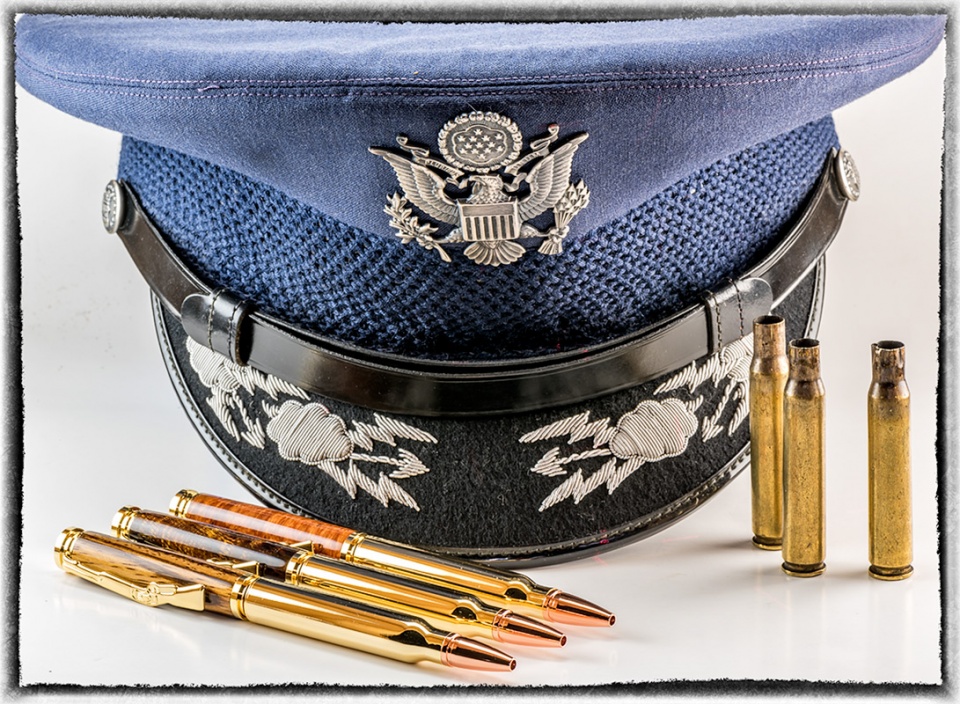 Today would have been my father's 85th birthday. He had his final flight (a term often used when pilots pass) last month, 18 April 2015. He was a Veteran of the Vietnam war and was a pilot in the Air Force earning Several Air Medals and a Distinguished Flying Cross. The upright shells in the background of the pens are from his 21 gun salute. The pens represent the 21 gun salute ceremony. I retire next year after 33 years in the Air Force and Air National Guard. It is indeed an honor and privilege I learned from my Father.