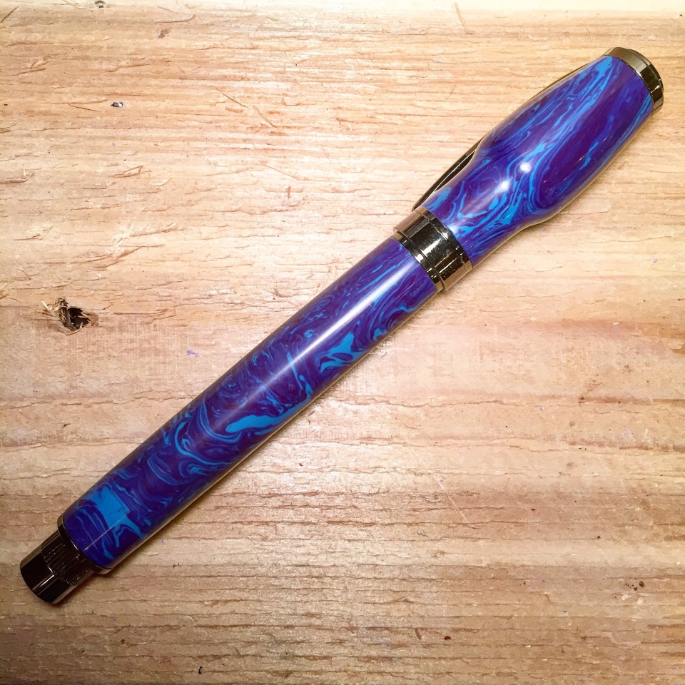 Turned this one out tonight. It is an Indigo Night Amalgum-mutt blank with a gunmetal Graduate Magnetic Rollerball kit. I made this to donate for an IG/FB auction where the proceeds will go to the Fallen Dallas Police Officers. Still trying to find the best way to finish these amalgum-mutt blanks. I really want a brighter sheen. My typical sand through 12,000 grit micro-mesh at 500rpm and the using some plastic polish just doesn't seem to get the sheen like other acrylics. Suggestions? Should I put a few coats of thin CA glue on it and buff that out? Thanks!
