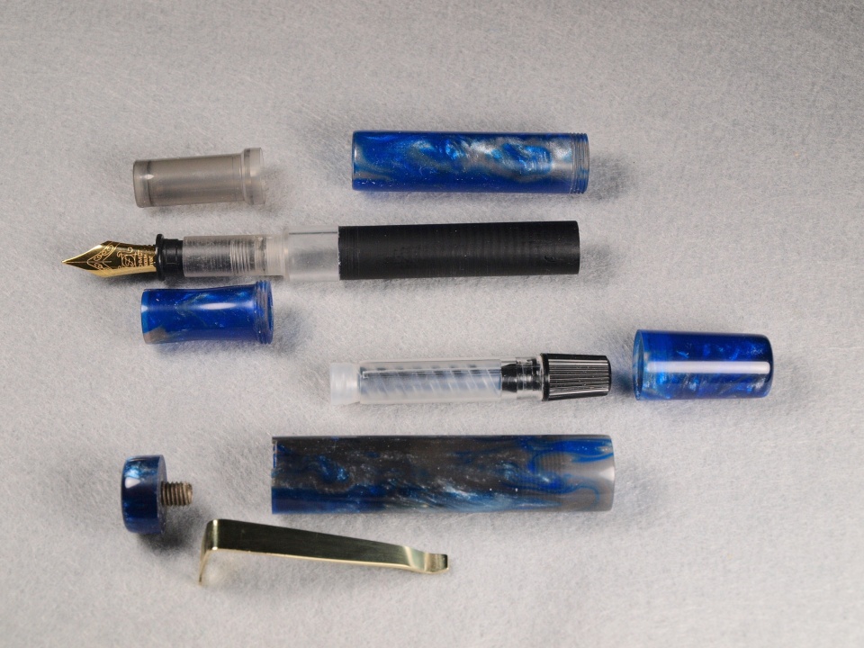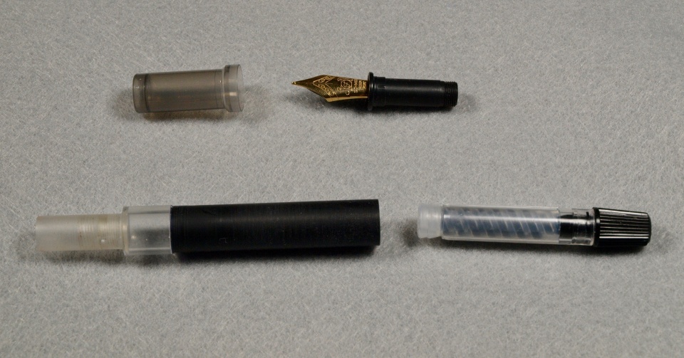 As you can see from the photo the barrel consists of an ink window with a turn down area for the section and a black barrel with the same diameter as the ink window. The piston is nicely made with a straight knurled cap to advance and retract the piston.