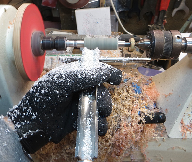 I tried several different chisels, including a 1" skew, 3/4" forged spindle gouge, and a 1/2" fingernail gouge. But the one I had the best success with was a 1" roughing gouge. I sharpened it several times during turning, and found that it cut best for me with it rotated slightly to the left. I don't know why. I did get some chipping here and there, but nothing too bad. I took my time, and channeled my inner patience. Yes, I still wear the glove. LOL