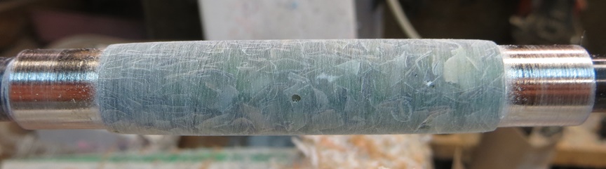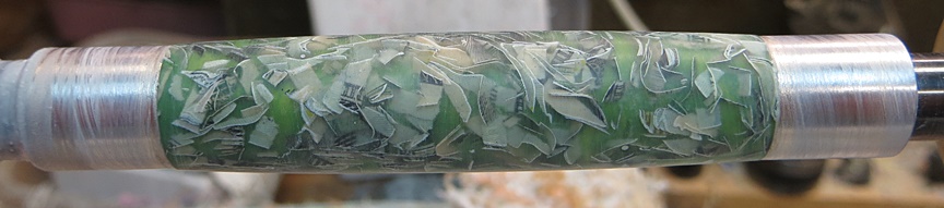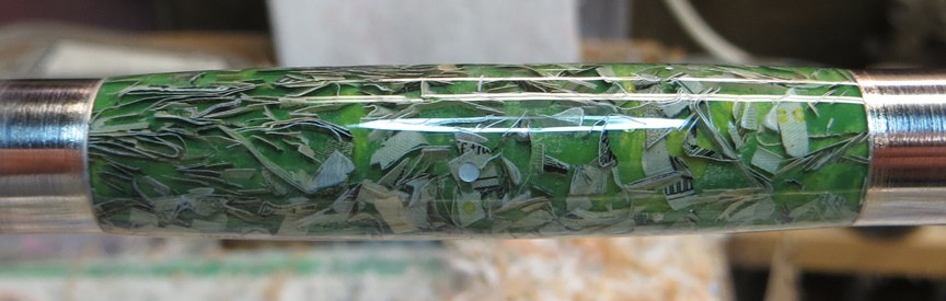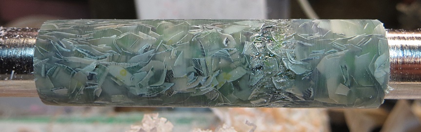 I got the blank in the mail yesterday, and started turning it today. Drilling it was no problem. I back painted the blank with kelly green acrylic paint, and colored the epoxy with the same paint. I also trimmed the corners with the bandsaw, to give myself a headstart.