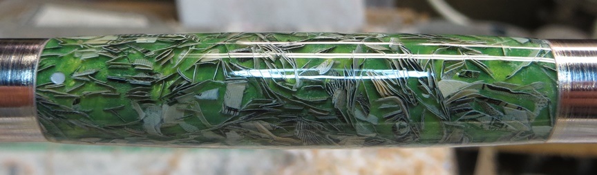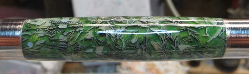 After wet sanding, I went through all 9 grades of Micro Mesh wet, then polished it with Meguiars PlastX plastic polish. There were a couple of small voids in it, but they disappeared during sanding. It polished out really nice. But you can see that the money shreds did get thin, and it's a good thing I reverse painted and colored the epoxy.