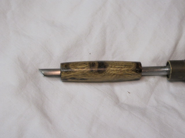 I read several threads on this site about people having problems removing all the glue from the inside of the pen tubes without removing brass and creating out of round tubes resulting in poorly fitting pen parts to tubes. You can take an inexpensive 1/4 inch gouge either bowl or spindle configuration and grind a opposite than typical 45 Degree grind which will create a bur that will remove glue without damaging the brass. I always use a Qtip to apply a release paste wax or lubricant prior to glue up. I use a tube insertion tool . After the glue is dry i use a mini chop saw to remove 1/16 inch of glue and wood off each end and use a hand countersink to smooth up the ends.Then remove any glue inside of the tube by inserting the tool mostly through the tube to push/ scrape the glue buildup from the outlet end . I had to sand my inside tube scraper slightly to fit through a 7 mm tube, now i can use it on any size tube. It actually performs its operation on fatter tubes with greater ease than on the 7 MM small ones.