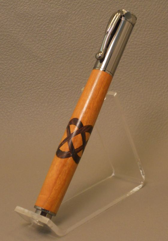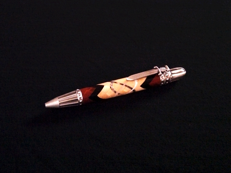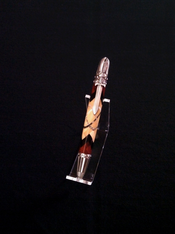 The Celtic Knight, A Knights Armor kit from Penn State Industries. A Herringbone 360 consisting of Redheart, Ebony, and Curly Maple. The Celtic Knot is four slices of .043 Crushed Pearl Acrylic in various colors. The pen has a CA finish.