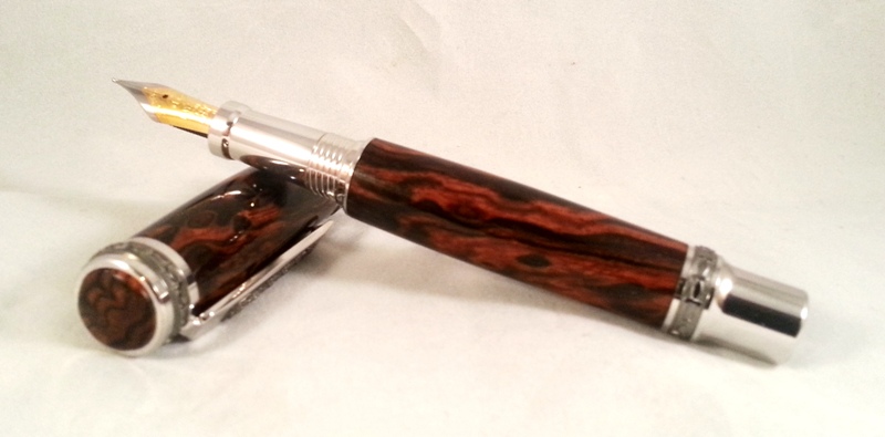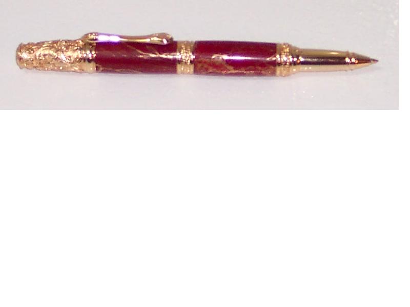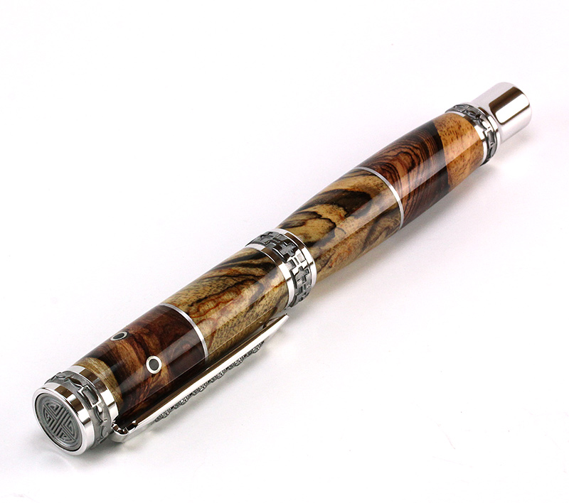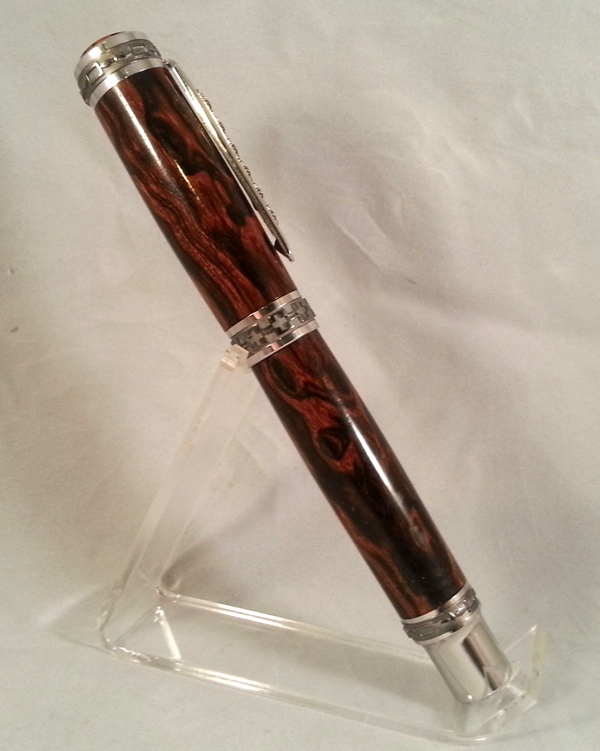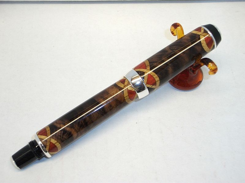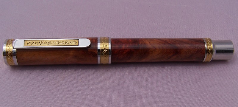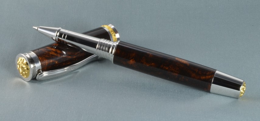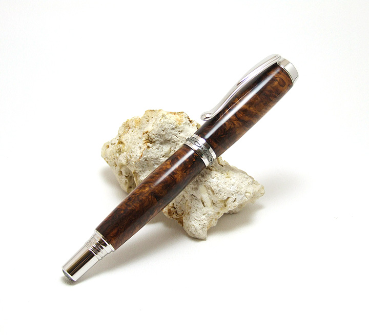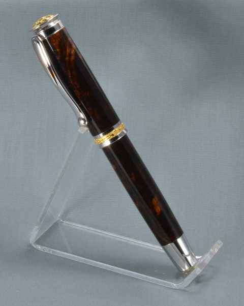 This is a Honduran Rosewood Burl blank on a Helix rollerball non-postable kit. The plating is rhodium and gold and the finish on the pen is CA.