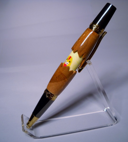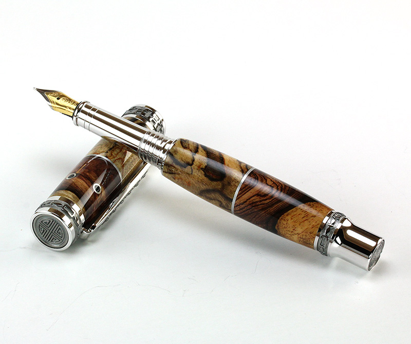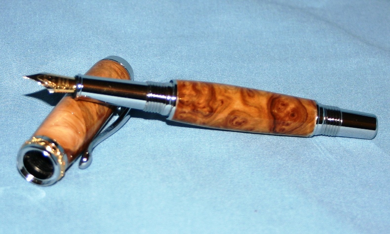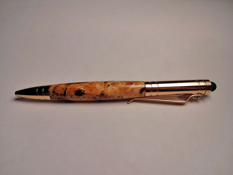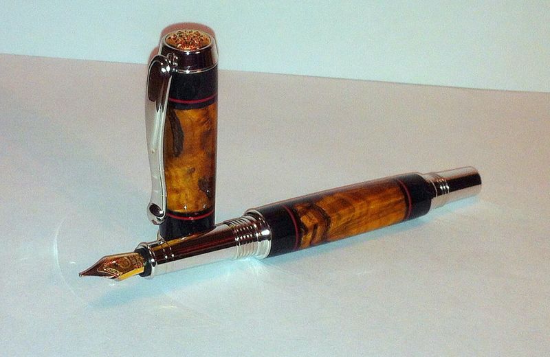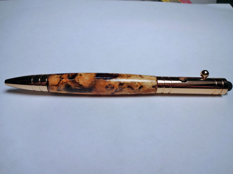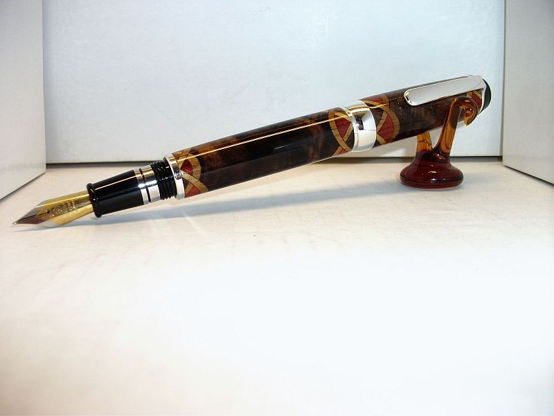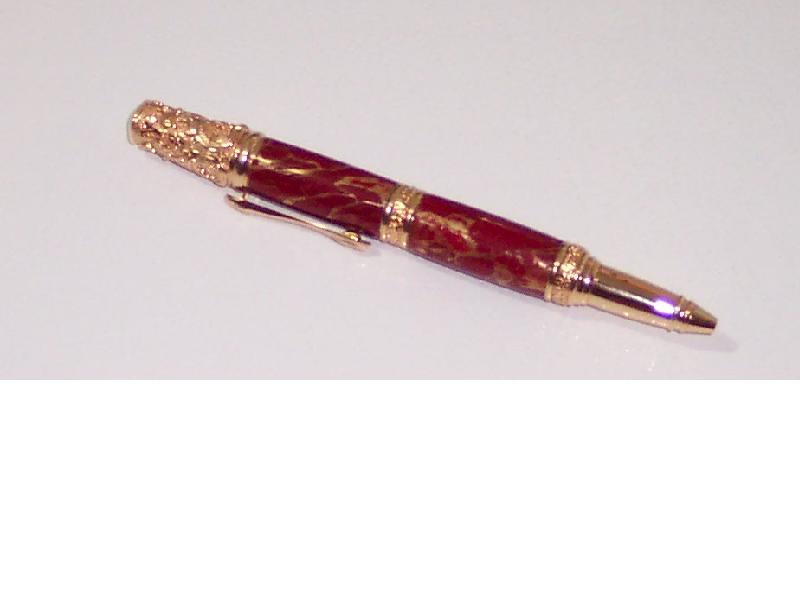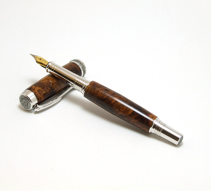 This is a Honduran Rosewood Burl blank on a Helix rollerball non-postable kit. The plating is rhodium and gold and the finish on the pen is CA.