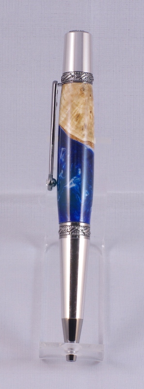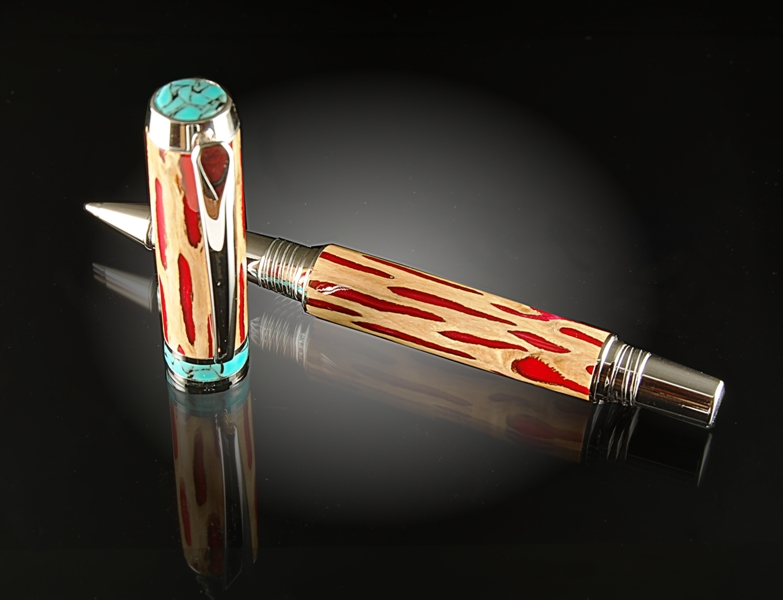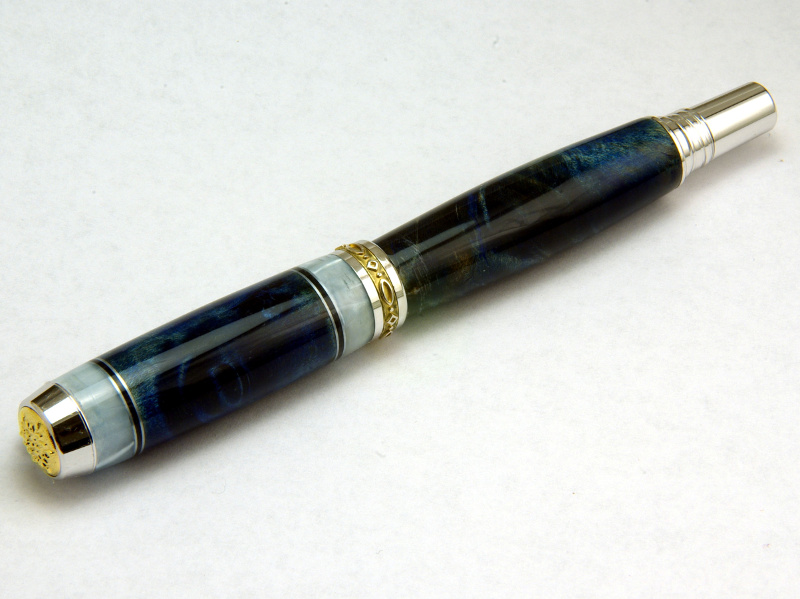 I finally made a pen for myself. It has a Jr Statesman Roller Ball Rhodium & 22KT gold kit. I stabilized buckeye burl blanks and segmented them with white Acrylic Acetate, Aluminum and carbon fiber. The barrels were sanded through 12k then dyed. Finish is 20 coats of Mercury CA.