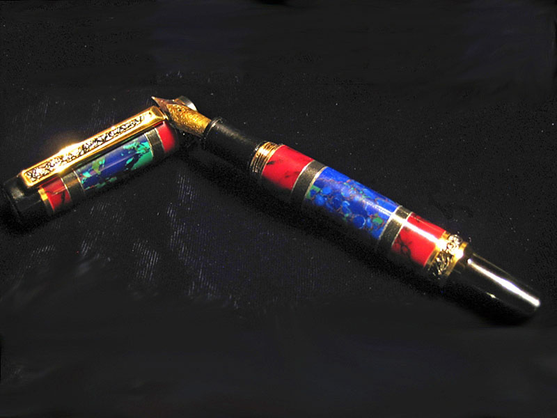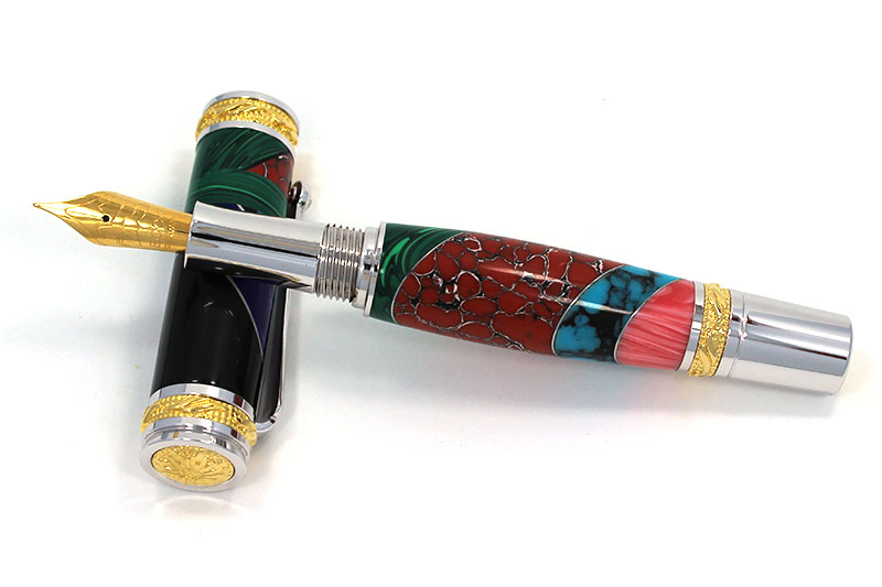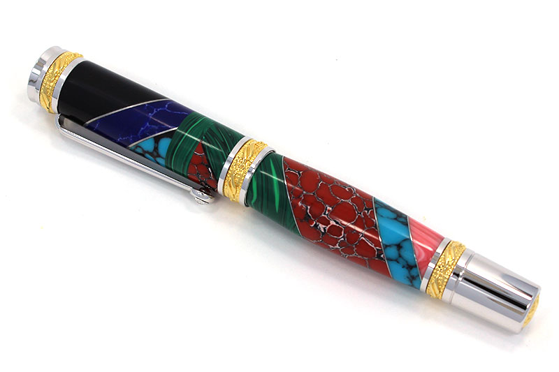 Cambridge fountain pen, segmented with trustone (bloody basin jasper, natural malachite/azurite, onyx) and aluminum.