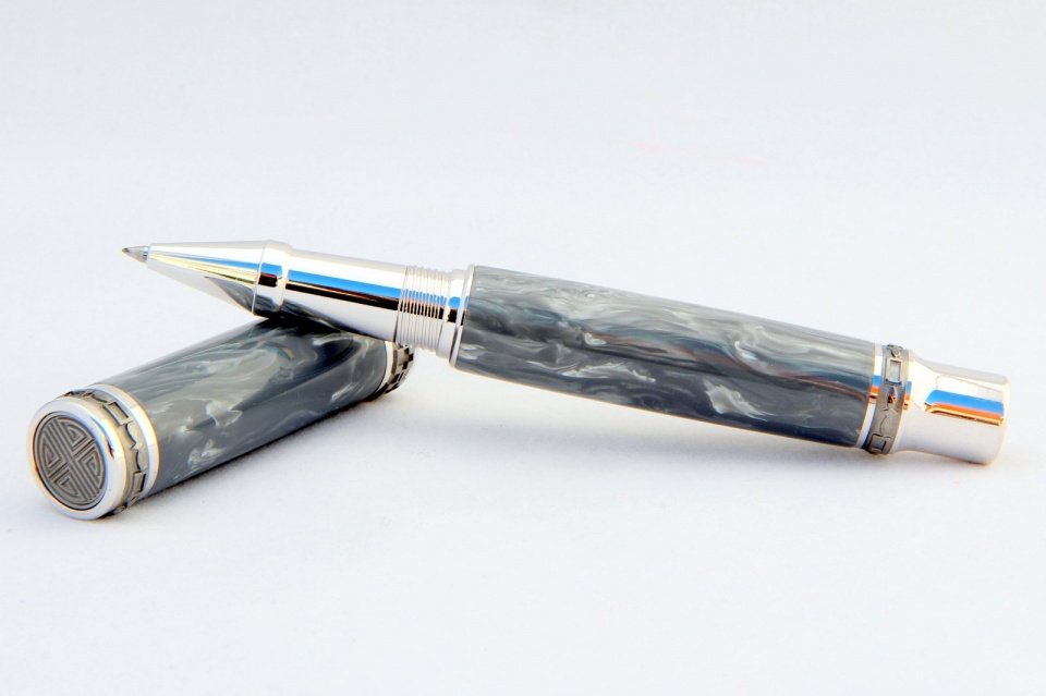 A full size Emperor in Rhodium and Black Titanium paired with a vintage piece of Gray with White Swirl Bakelite.