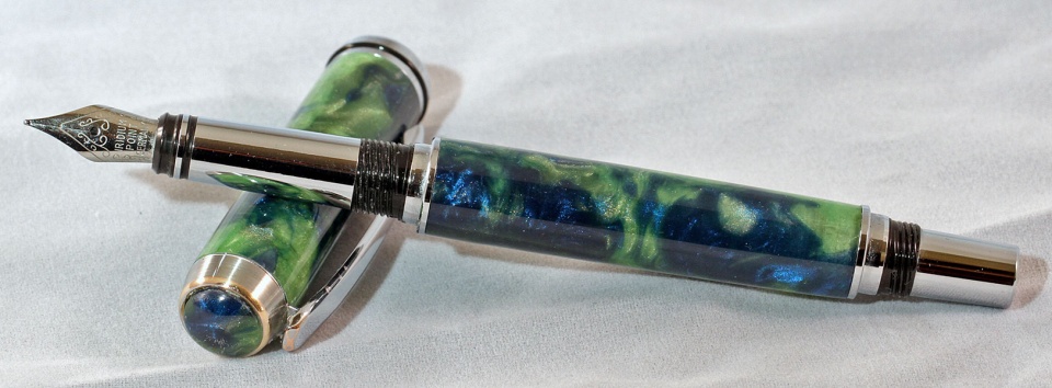 This is a Jr Gent 1 Fountain Pen Kit made with a navy blue and light green acrylic blank... AKA Seattle Seahawks colors!! I made the pen during the Super Bowl weekend. The blank was sanded through 600 grit then wet sanded with Pacific Northwest rainwater through MM 12,000. I don't expect many votes because of the Seahawks theme. Everyone in the country (and in our family) seemed to be for Denver... I thought of sending the pen around to all of our family members to sign the checks for the money they owed us after losing but decided against it. However, you can't say too many things about a team that defeats its opponent 43-8!! Go Hawks!!!