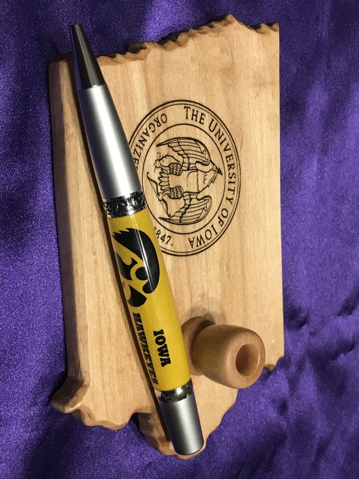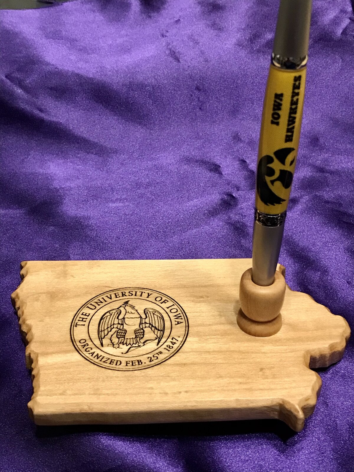 I made this for a friend. She said her family is from Iowa and they're all big Hawkeye fans. The pen is vinyl logos on cotton cloth. The stand is maple. Questions and Comments Welcome.