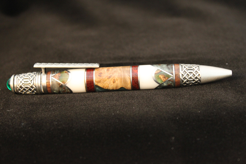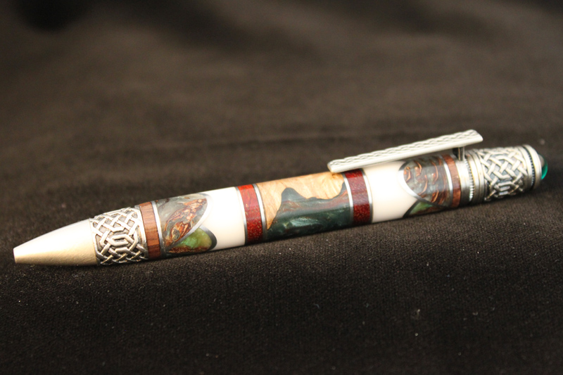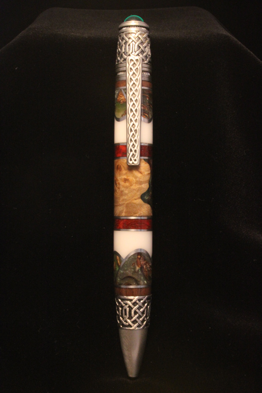 This was done for our local IAP contest. Pen had t have an Irish theme. Chose a Celtic Pen kit. Used pine cone and walnut shell cast in green alumilite/acrylic for the scallops/4 leaf clovers. Corian for the white, walnut for the top and bottom segments. Pauduk for the red/orange segments. The middle section is maple burl with green alumilite. Irish flag is green, white, orange.