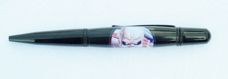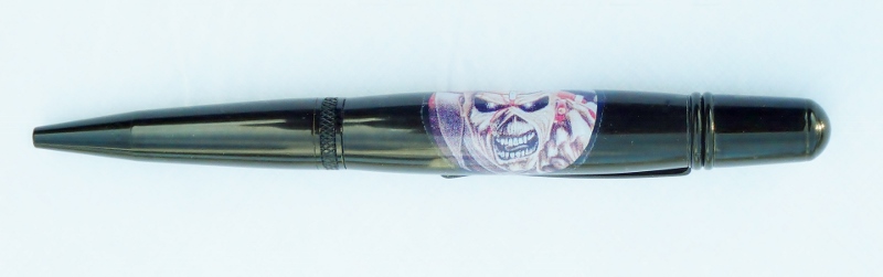 I managed to obtain a few limited edition bottle caps featuring Eddie the Trooper from Iron Maiden's Trooper beer (TROOPER - Premium British Ale from Iron Maiden). This black chrome Sierra is the first pen I have turned from them.