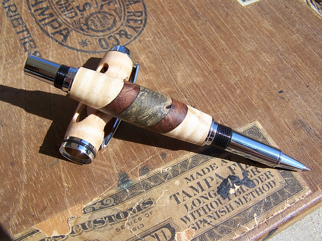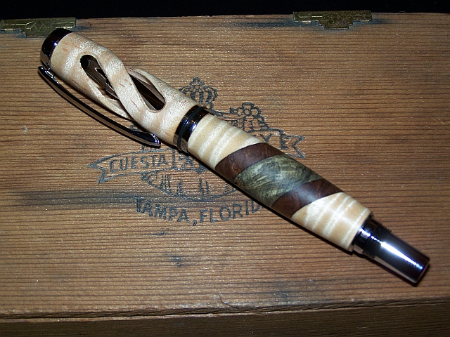 Made this pen from Tiger striped Maple, Walnut, and Buckeye Burl, with a top that has been milled thru to allow a view of the nib. I have had this pen for 2 years, and having it open like this has not caused the ink cartridge to dry. C&C's appreciated, thank you.