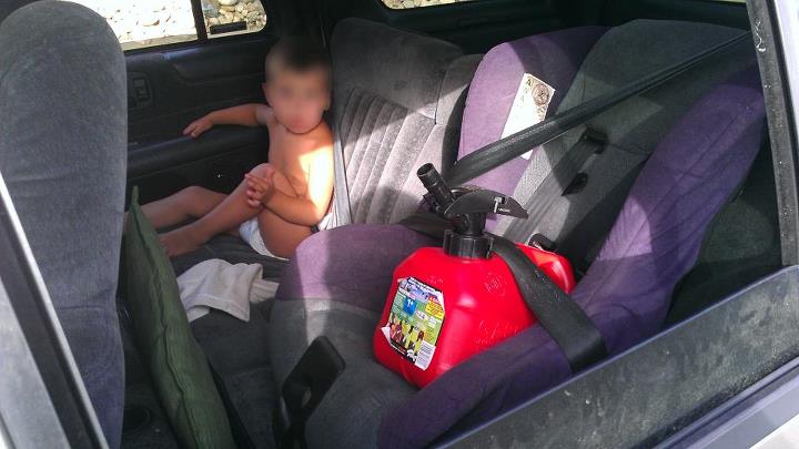 No one has commented that the gas can is strapped (incorrectly by the way) in a childs seat while the kid is free to play with the gas ... which is to be expected if it's gene pool has provided enough brain matter to enable it to do so in the first place.